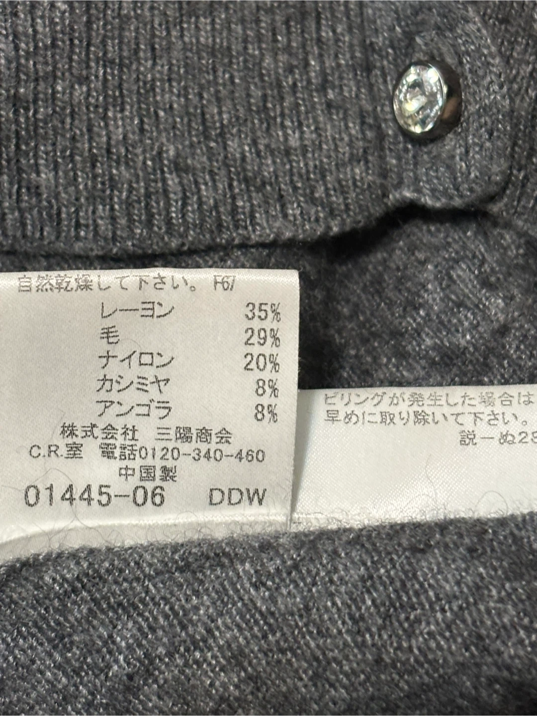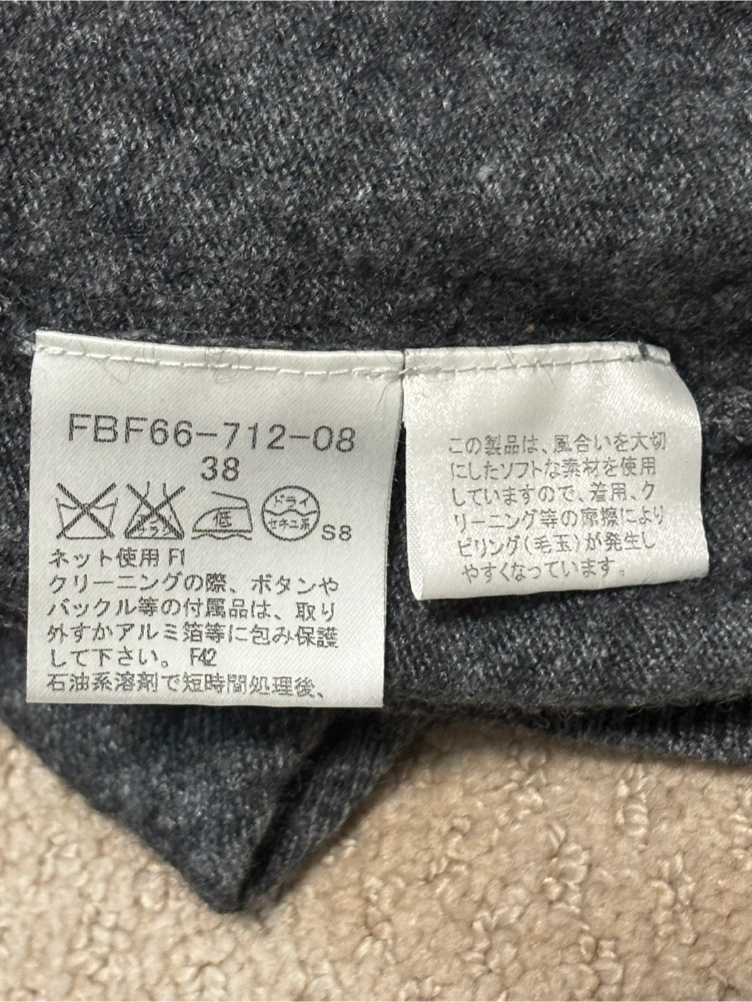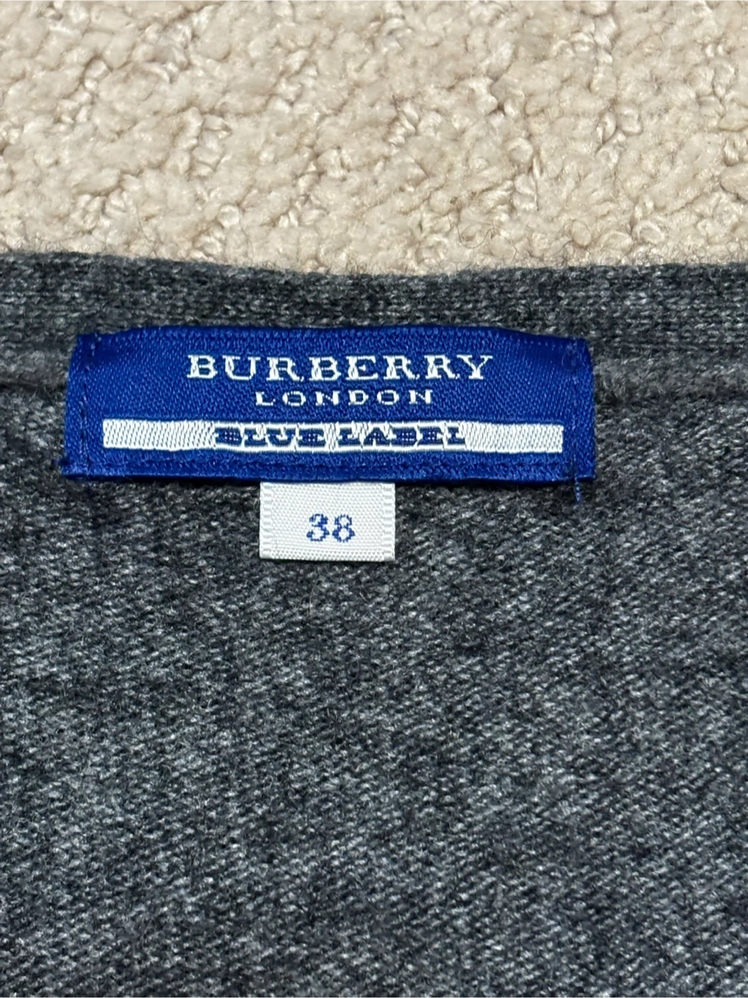 41Here's a lovely Burberry London Blue Label cardigan in a stylish grey colour! It's a size 38 and made from a blend of materials including rayon, wool, nylon, cashmere, and angora. It has shrunk after the few washes. Perfect for layering or wearing on its own!