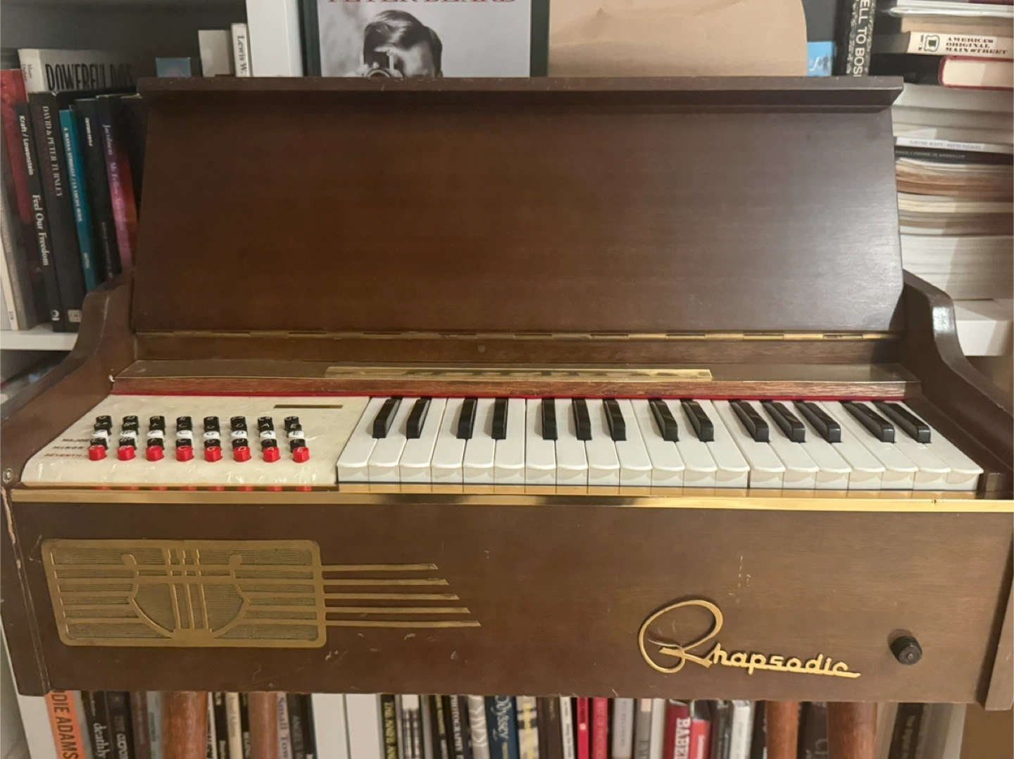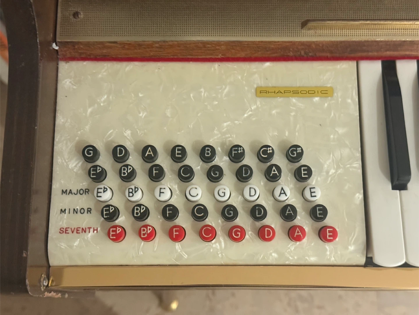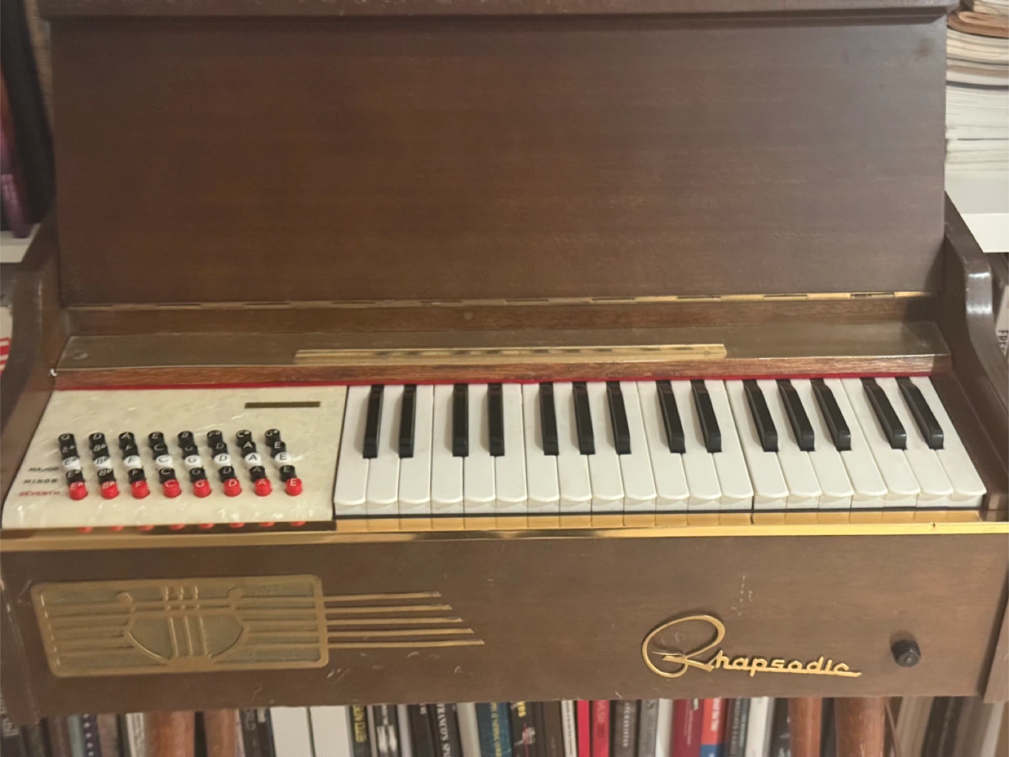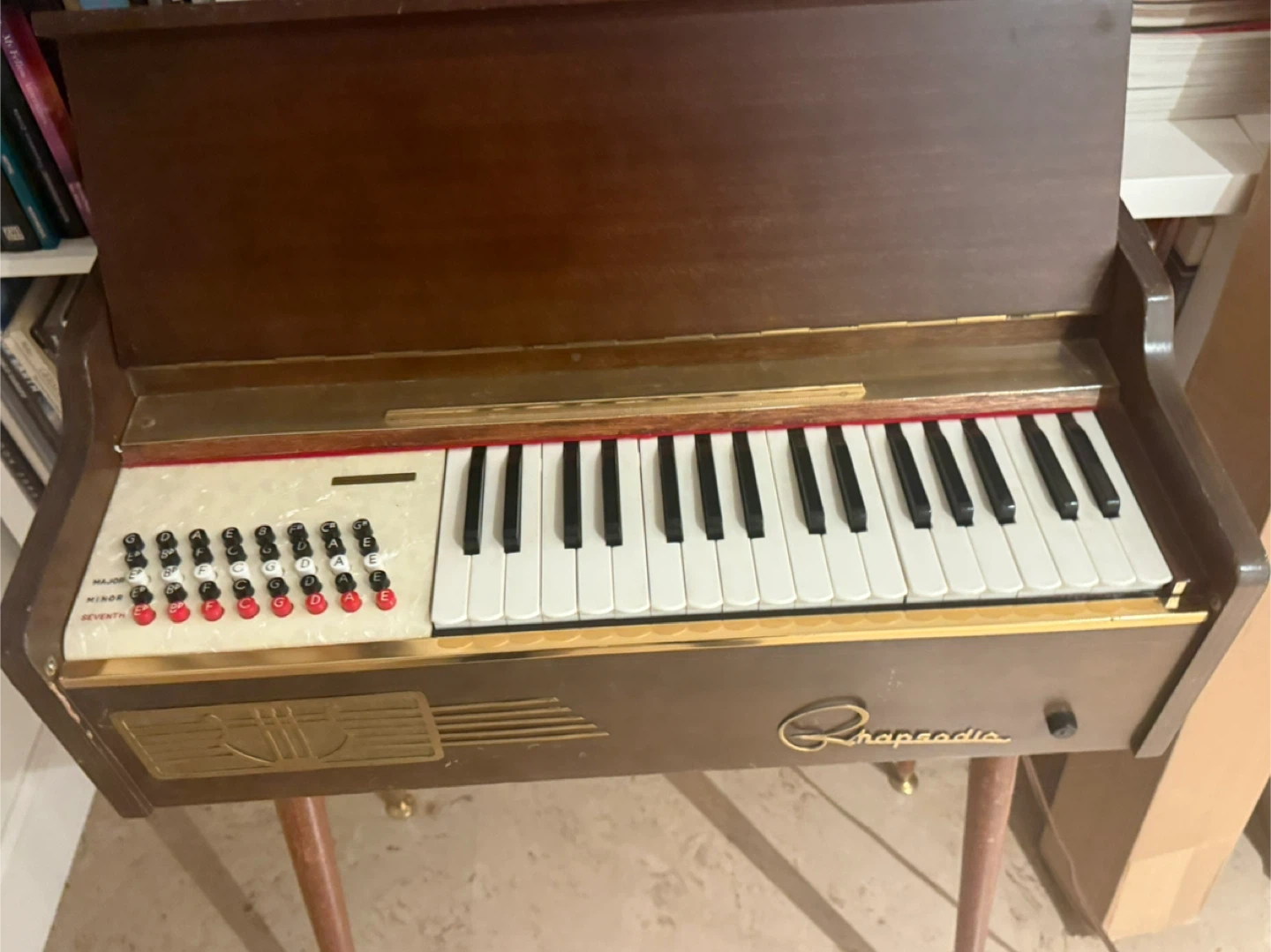 Selling a vintage Rhapsodic chord organ. It's a unique piece with a retro look. Perfect for someone interested in vintage instruments or unique musical pieces