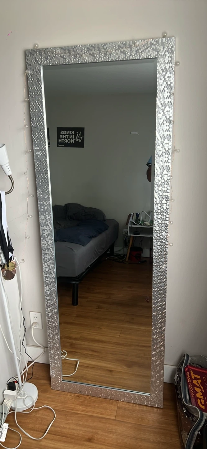 Selling a full-length mirror that would be a great addition to any room! It features a stylish silver mosaic frame that adds a touch of elegance and uniqueness to the design. It's in great condition and ready to find a new home