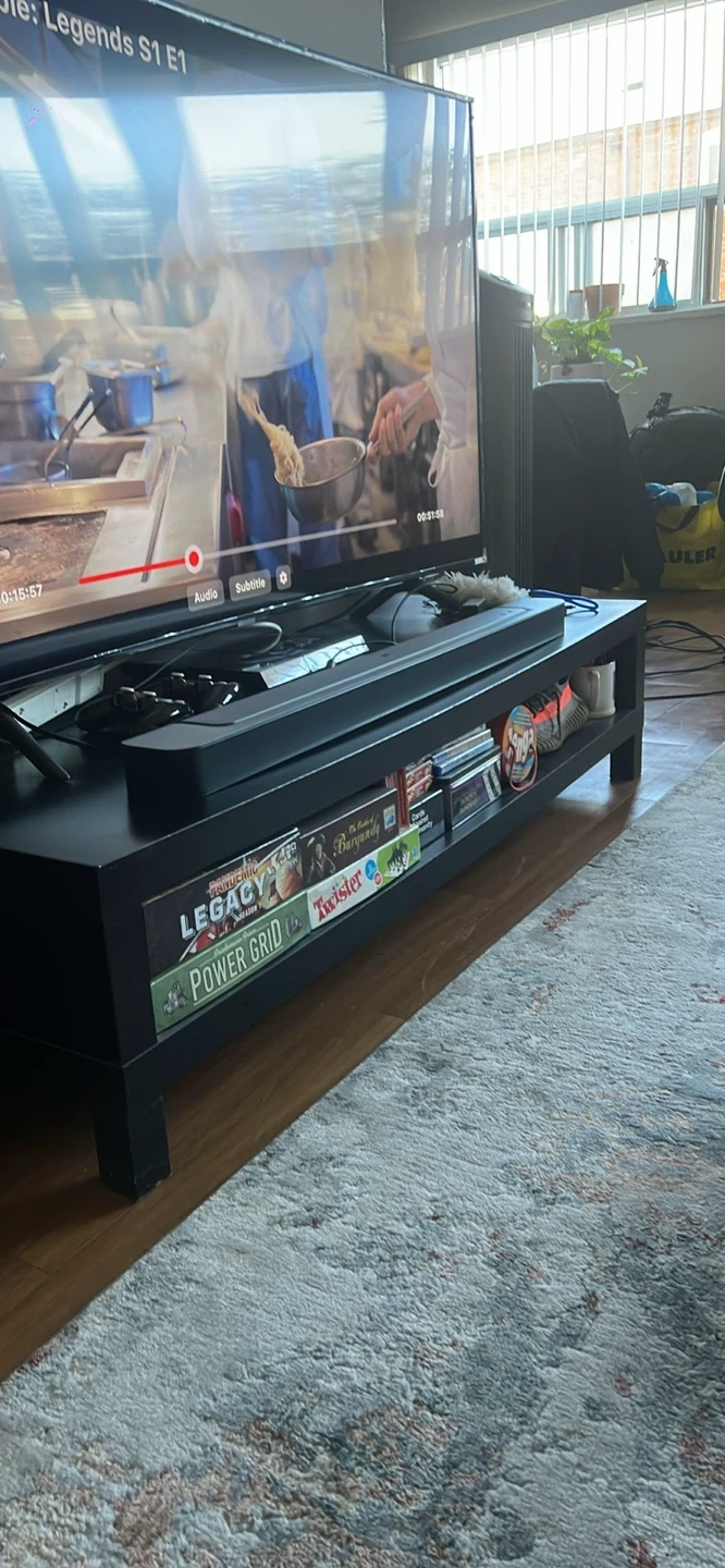 79Selling a black TV stand or console table. It's in great shape and ready for a new home! Perfect for holding your TV and storing games or other items on the shelf below