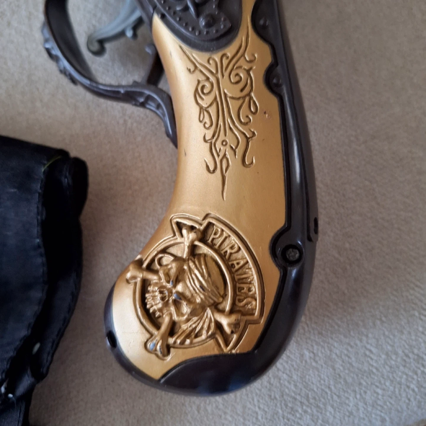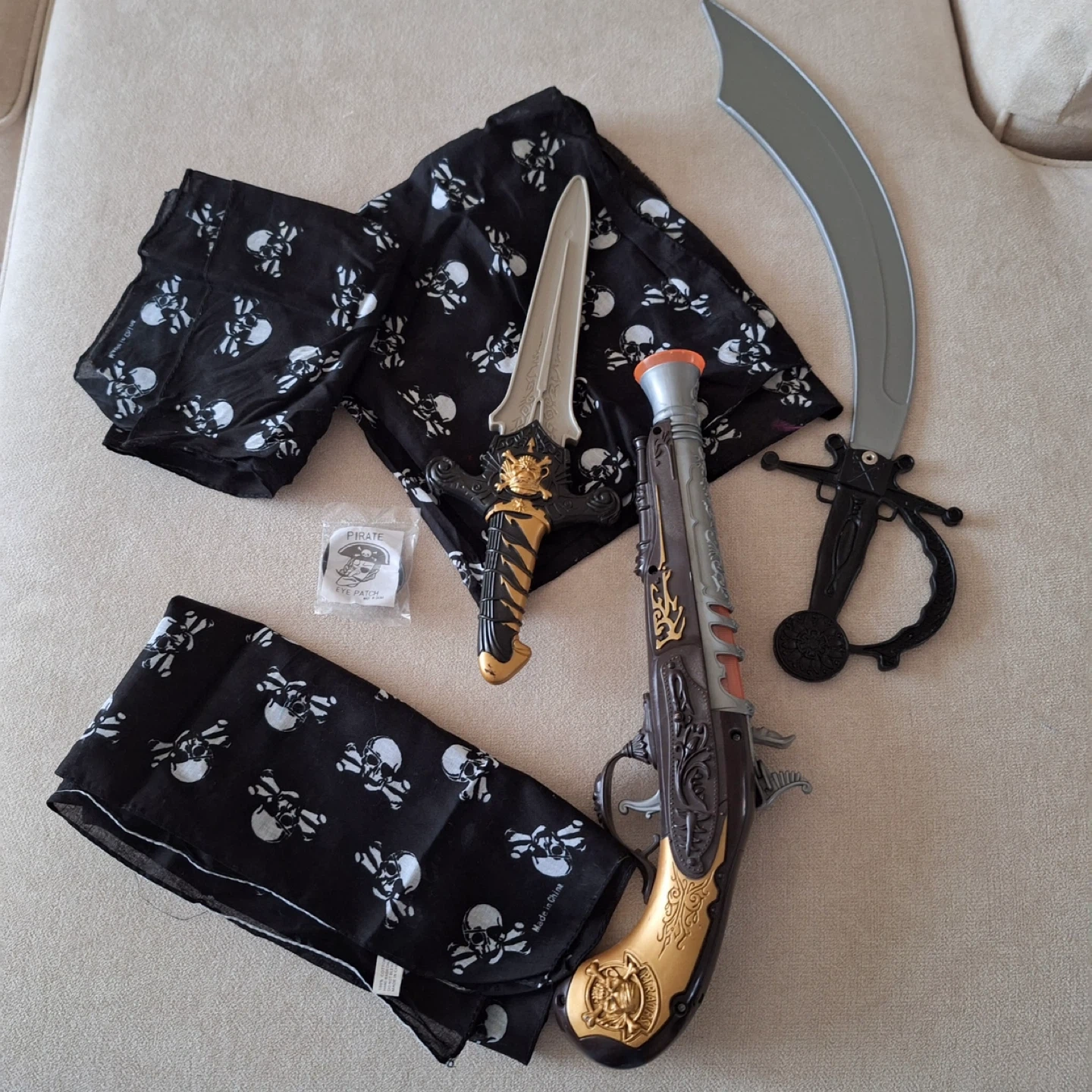68Ahoy there, mateys! Get ready for some swashbuckling adventures with this fun pirate costume set! It includes a pirate bandana, toy sword, new eye patch, toy dagger and toy pistol. Perfect for dress-up or Halloween!