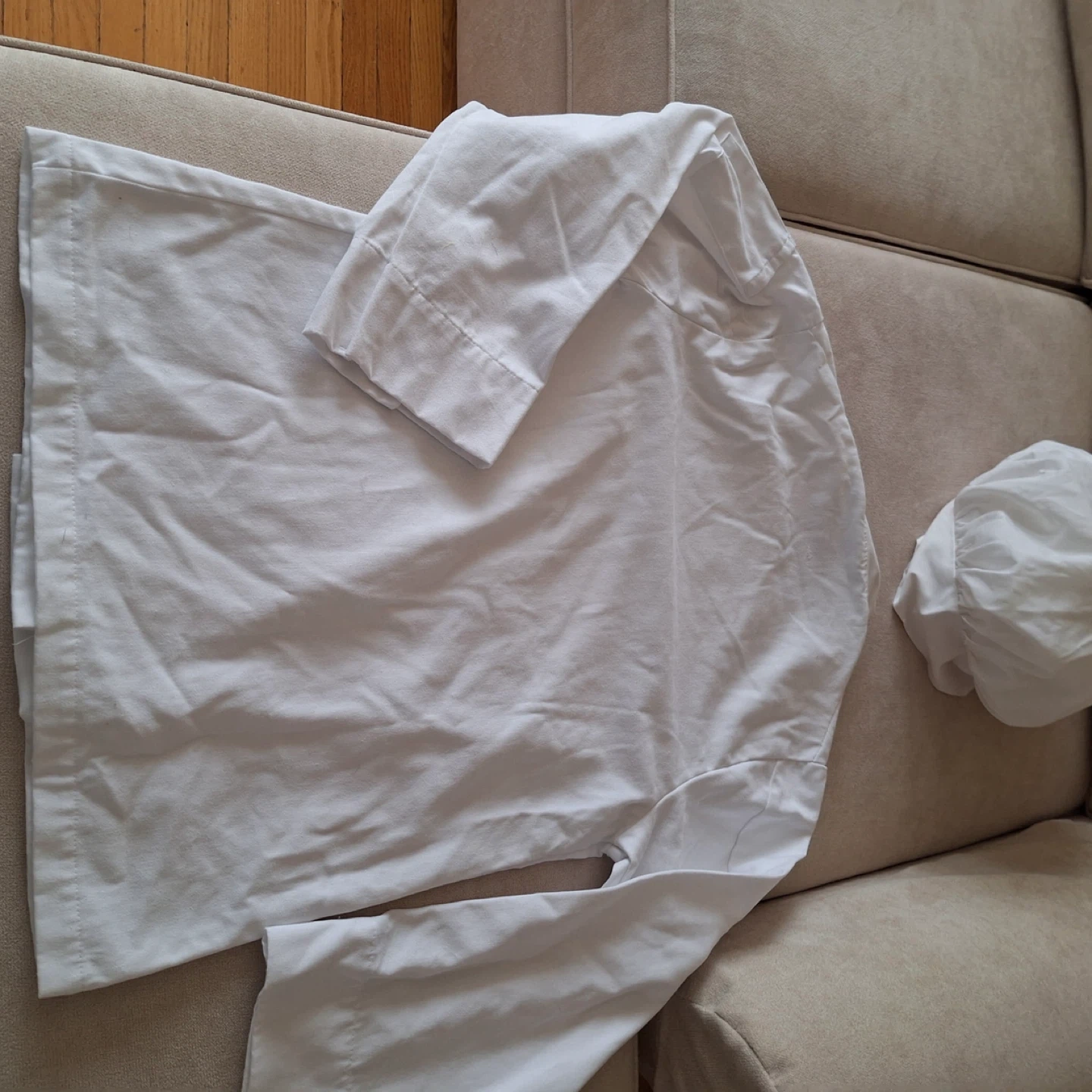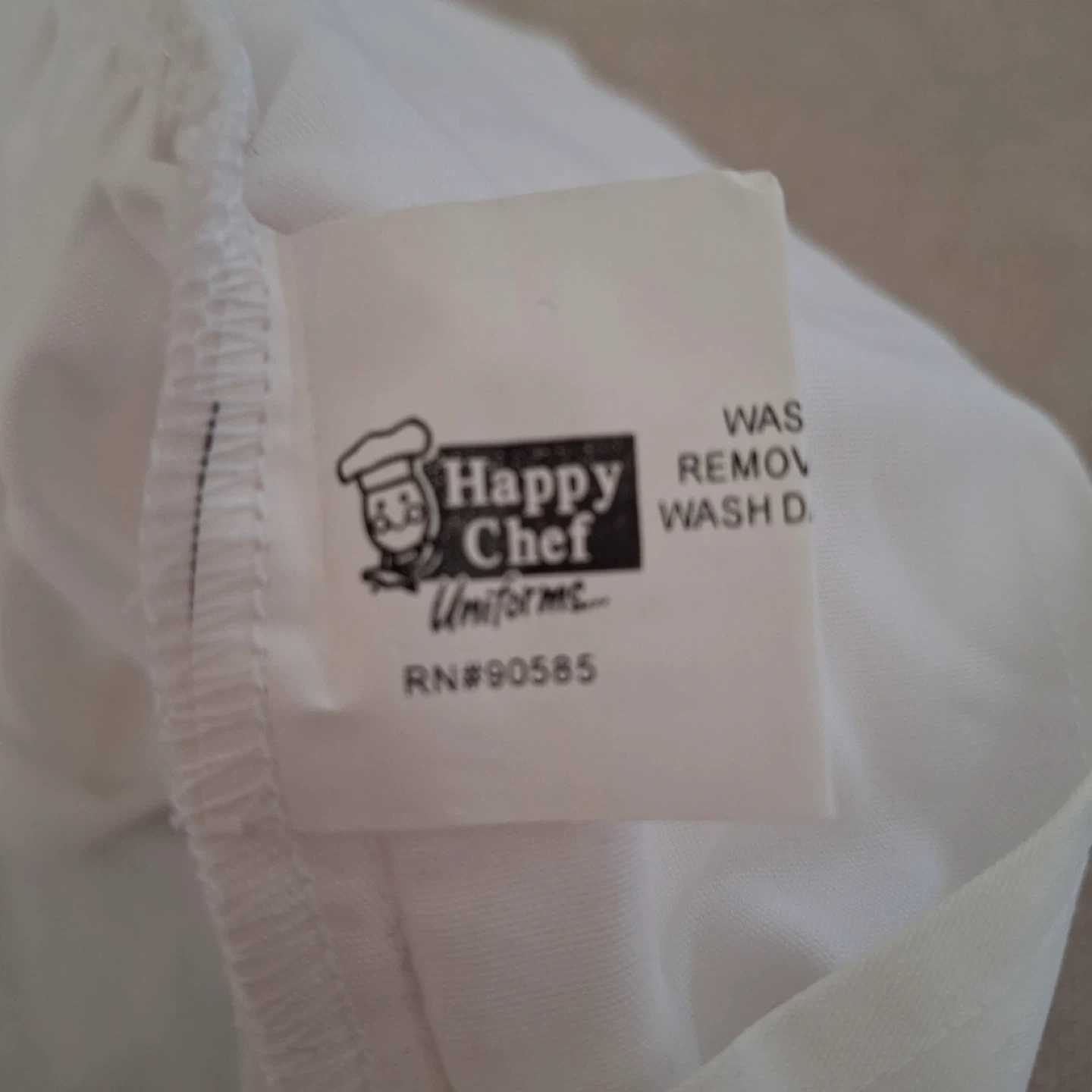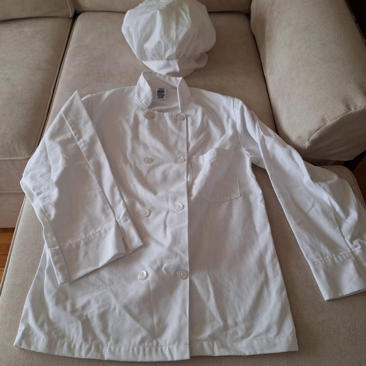 68Chef's jacket and hat set from EWC Inc. Size XS. The jacket is white with button closures and a pocket. The material is 65% polyester and 35% cotton. Machine washable and tumble dry