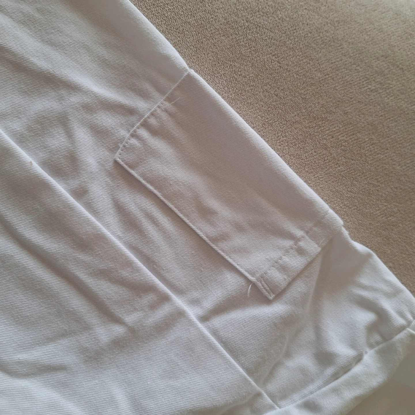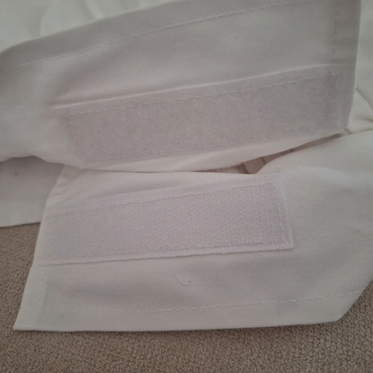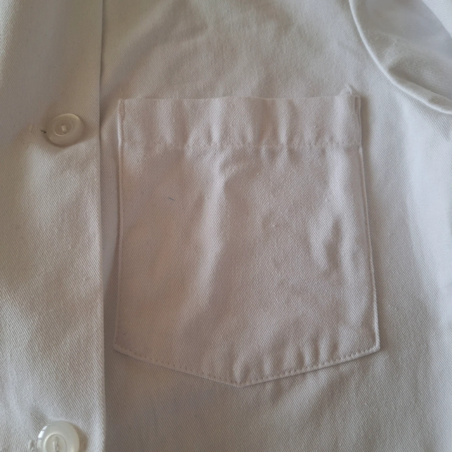 68Chef's jacket and hat set from EWC Inc. Size XS. The jacket is white with button closures and a pocket. The material is 65% polyester and 35% cotton. Machine washable and tumble dry