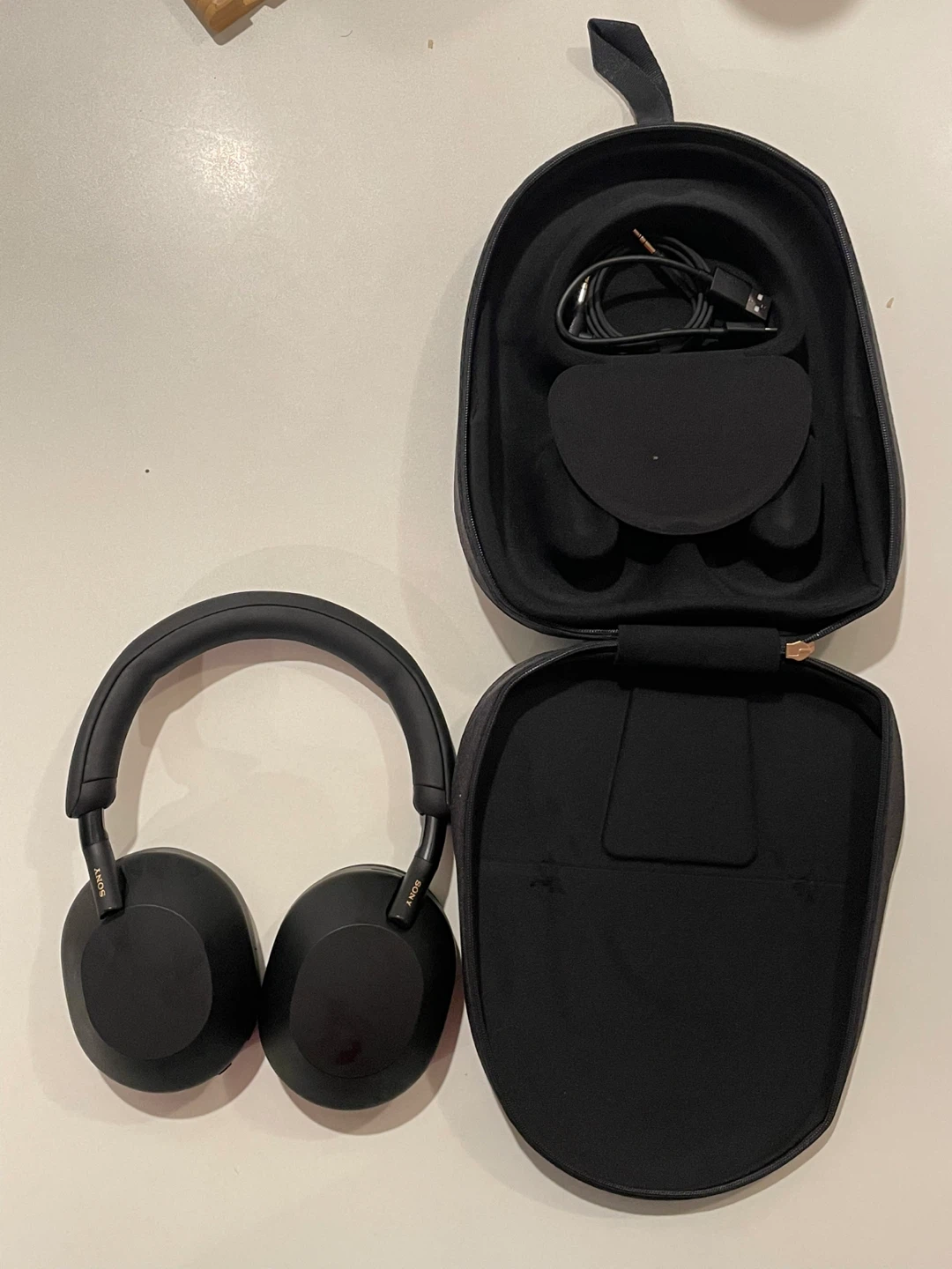 Selling a pair of Sony WH-1000XM5 wireless noise cancelling headphones in black. They come with the original case and a cable. Perfect for travel or just enjoying your music in peace!