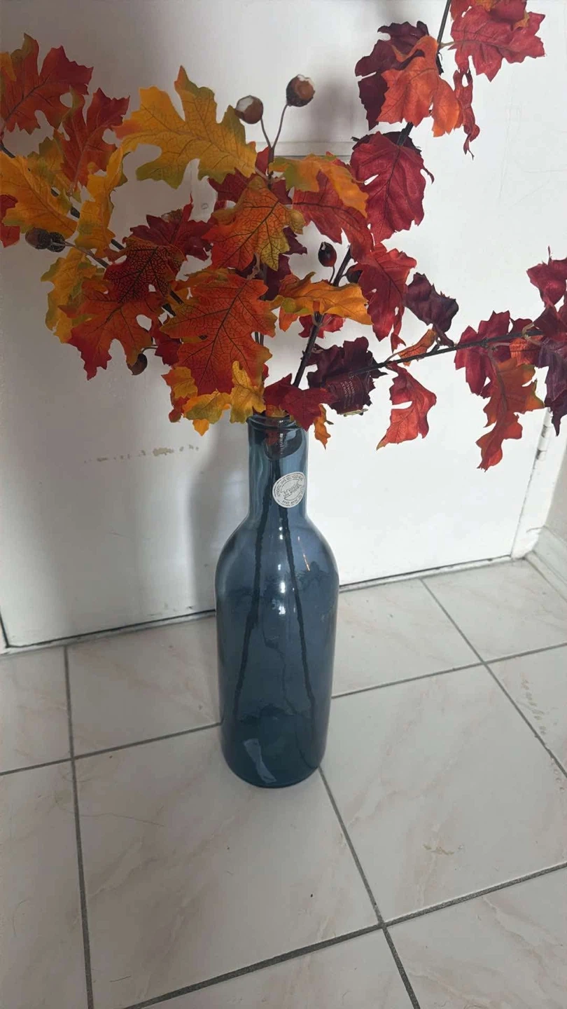 A lovely blue glass vase, perfect for displaying fall foliage or any floral arrangement! It comes with some artificial fall leaves to get you started. The vase is in great condition and would look great in any home
