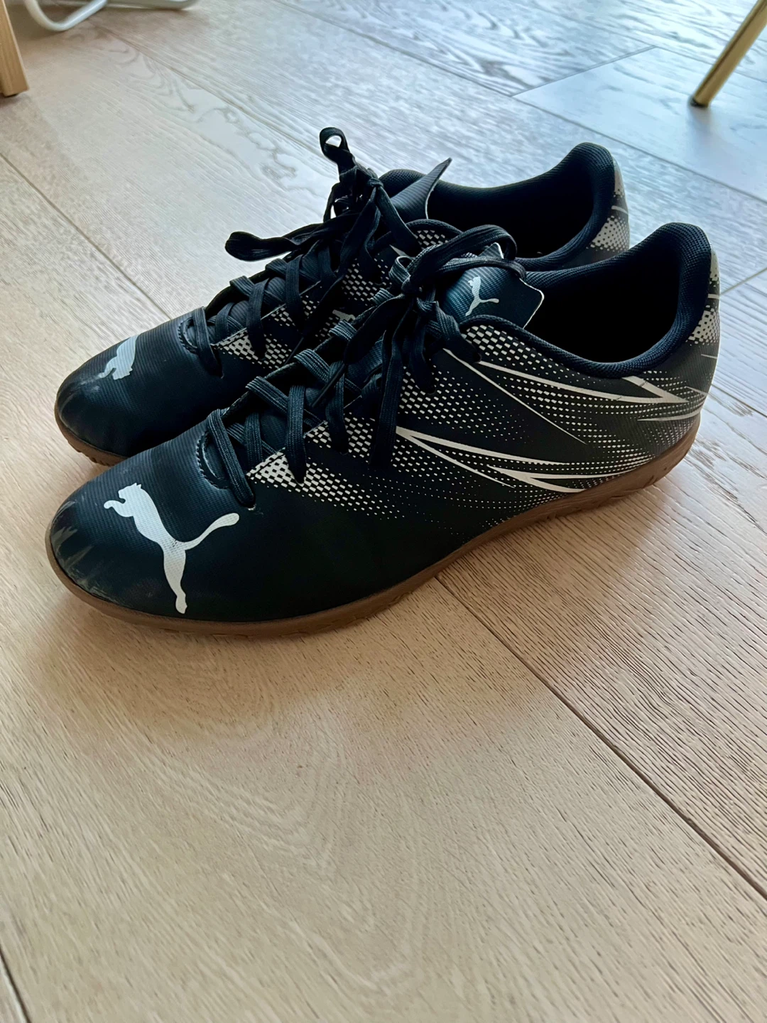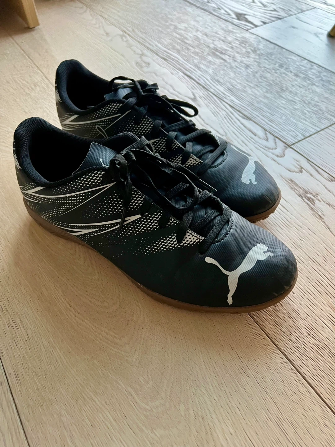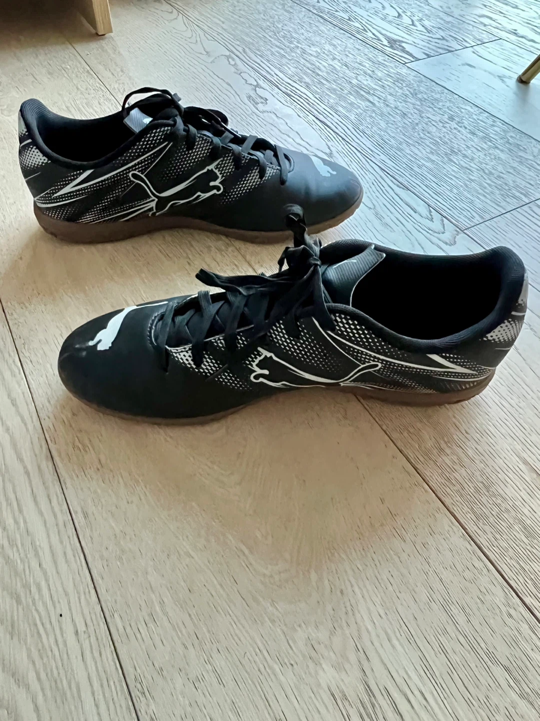 Selling a pair of Puma indoor soccer shoes. They are black with white accents and the Puma logo on the side. Good condition and ready for your next game!