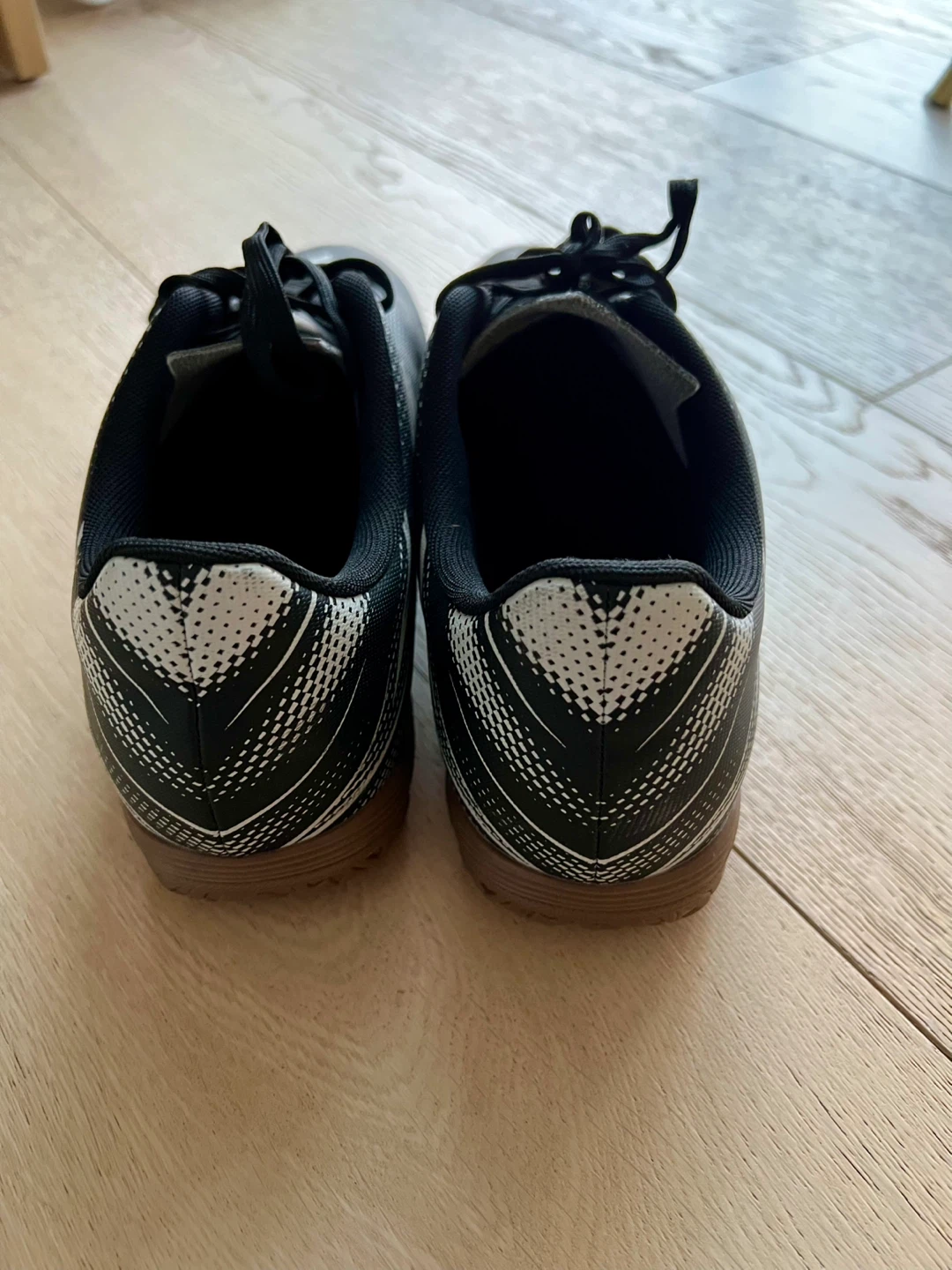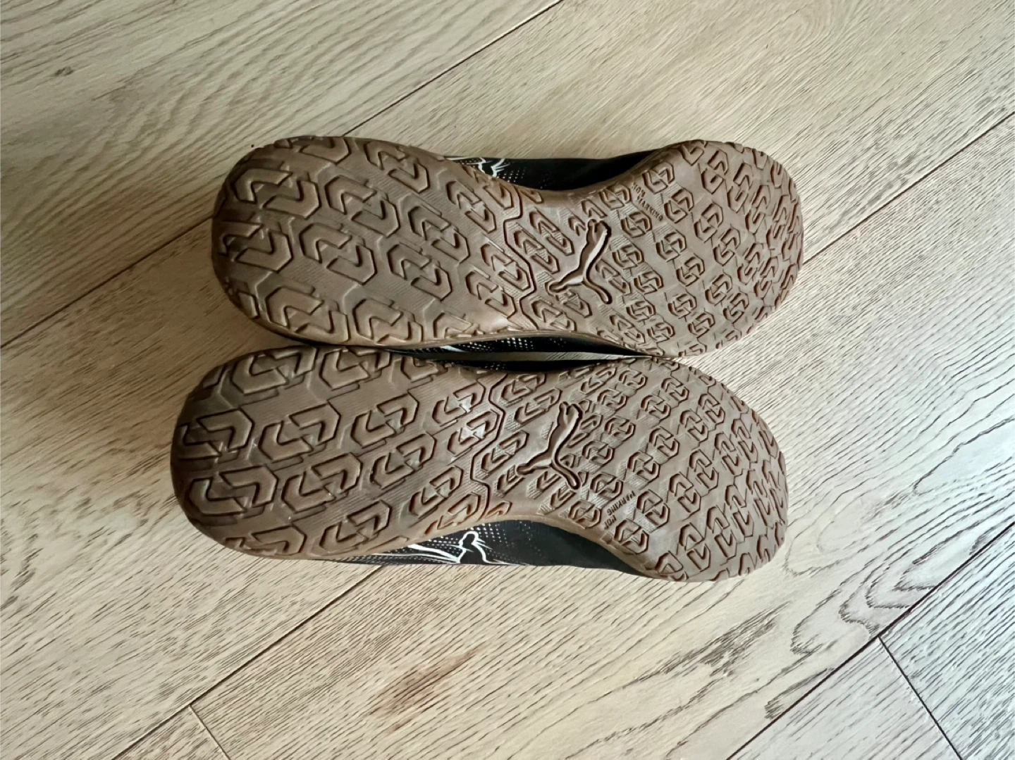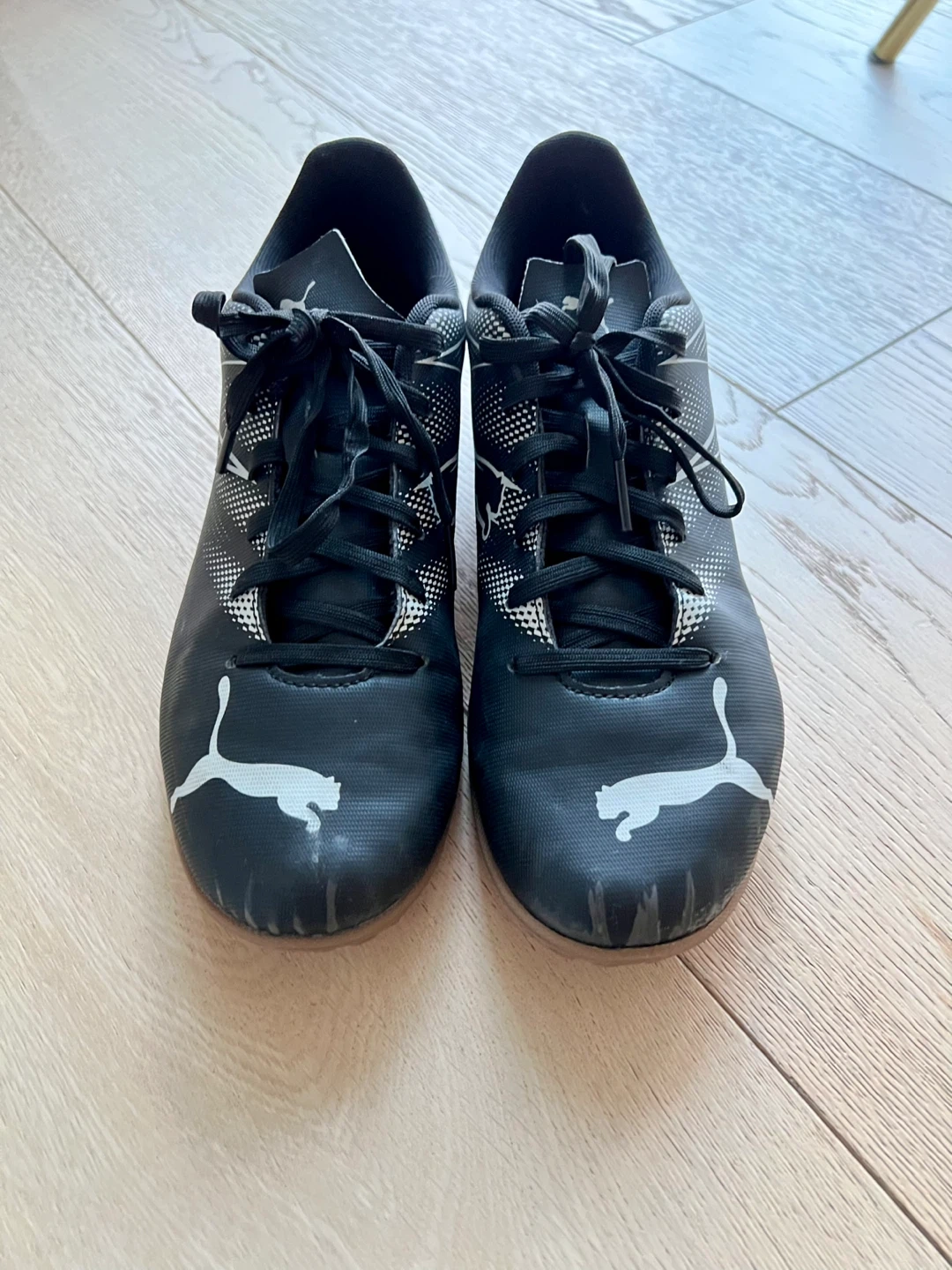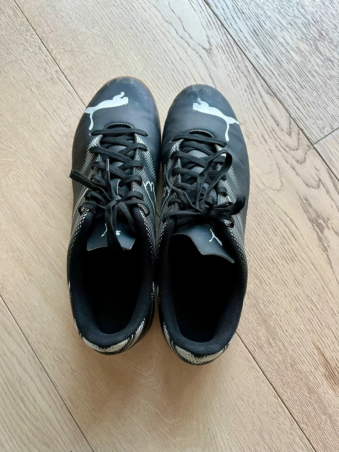 Selling a pair of Puma indoor soccer shoes. They are black with white accents and the Puma logo on the side. Good condition and ready for your next game!