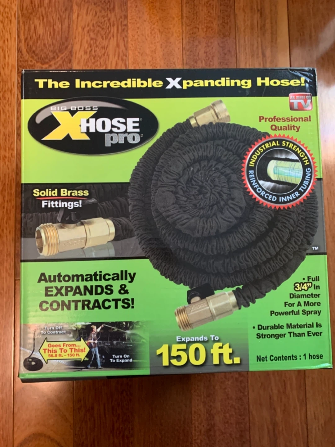42Selling a Big Boss XHose Pro, the incredible expanding hose! It expands to 150 ft and automatically expands and contracts. It features solid brass fittings and durable material that is stronger than ever! The hose is 3/4" in diameter for a more powerful spray.