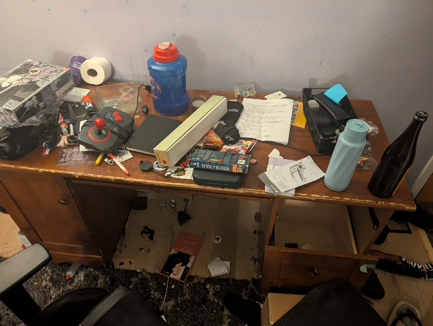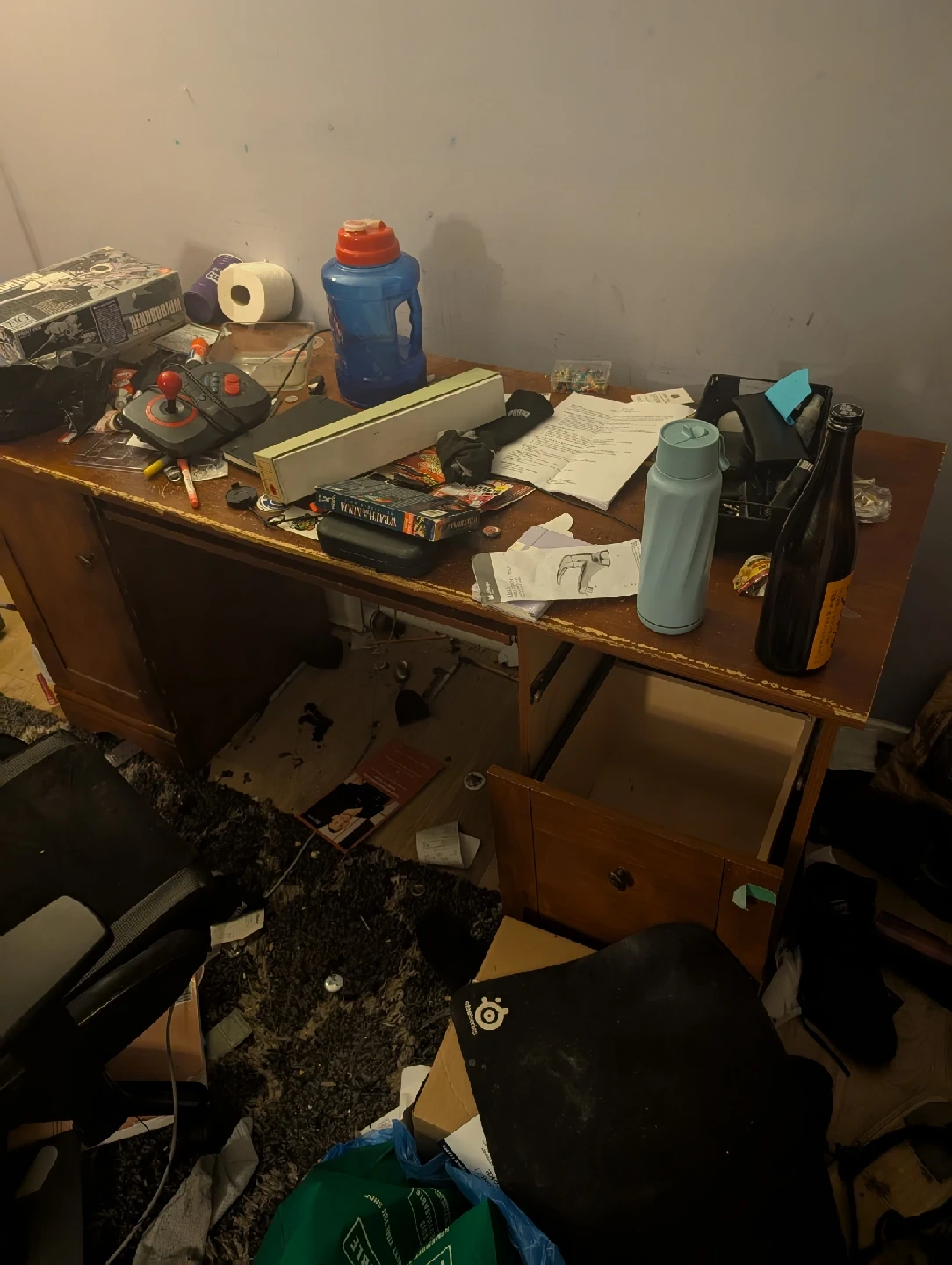 20 something year old desk. The shelves are gone in the front. I'm in the middle of a move, so I need this gone. You're just seeing the debris from the move, so it's just me moving it out