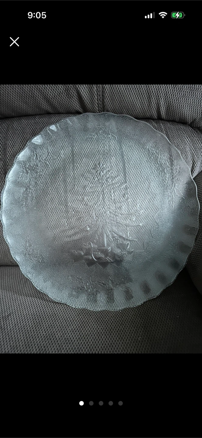 871Selling a lovely glass serving platter. It has a delicate leaf design etched into the surface. Perfect for serving appetizers or desserts at your next gathering! Small scratch as shown in last two photos, smoke free home.