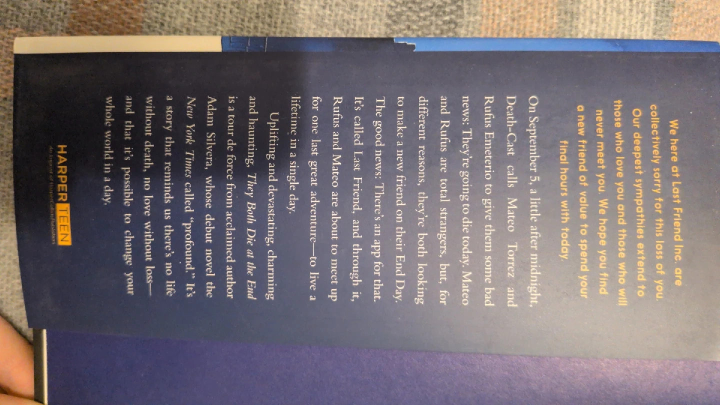 Selling a copy of "They Both Die at the End" by Adam Silvera. It's a New York Times Bestseller and a captivating story about love, hope, and friendship. Perfect for anyone looking for a thought-provoking read! Conditions of the book are good but the edges of the cover are a bit crumpled.
