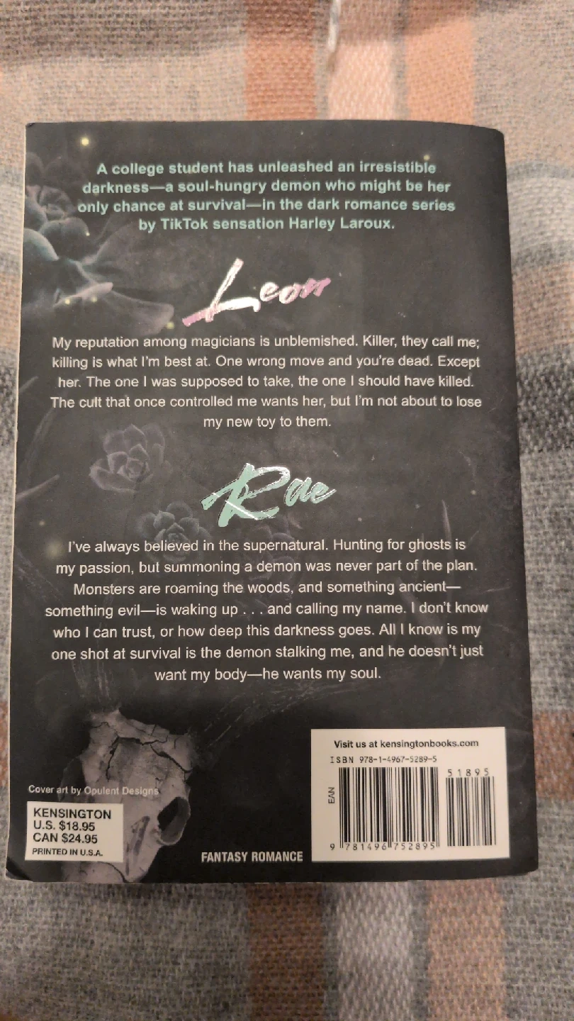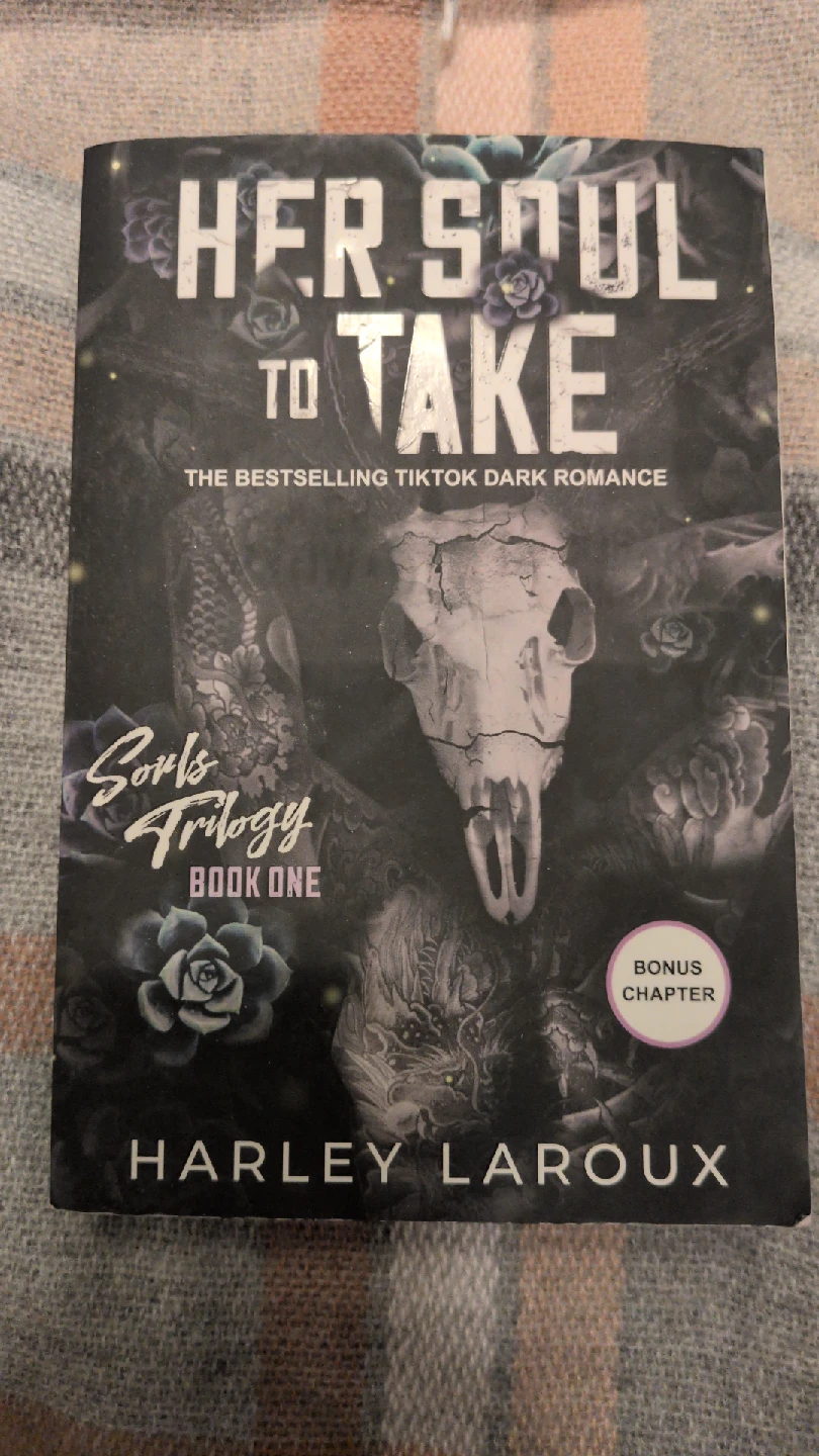 Selling "Her Soul to Take" by Harley Laroux, the first book in the Souls Trilogy. It's currently a very popular TikTok dark romance novel with a bonus chapter. The cover art is by Opulent Designs. A college student has unleashed an irresistible darkness, and now she only has one chance at survival. Recommended for ages 18+. First bought at $24.95, now selling it at $10!