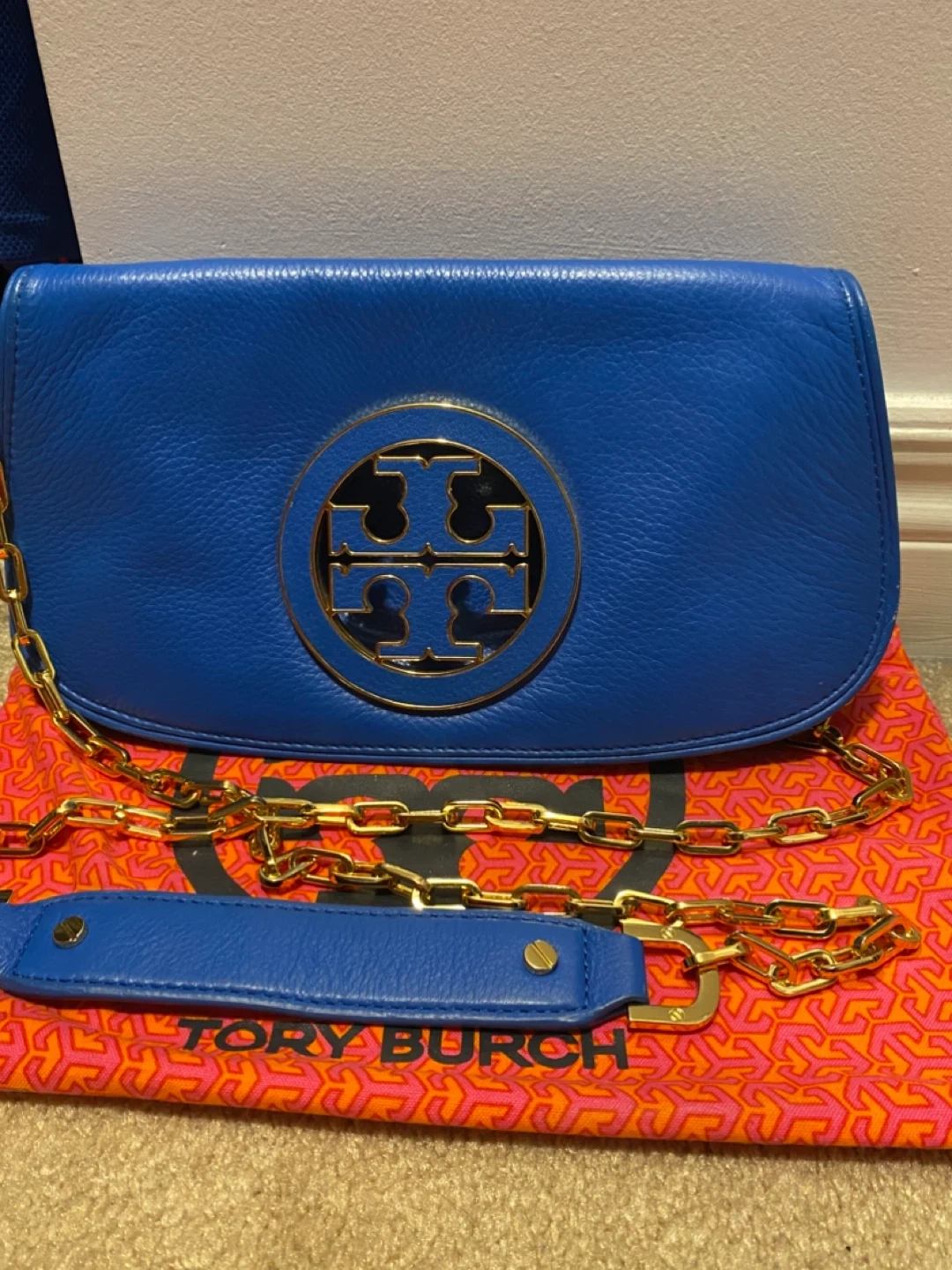 Check out this lovely Tory Burch crossbody bag! It's a beautiful blue colour and made of leather. It has a gold chain and the iconic Tory Burch logo. Perfect for adding a pop of colour to any outfit!