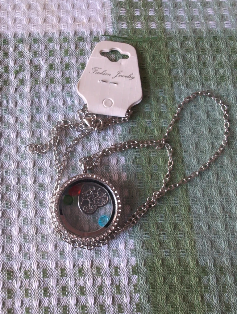 Silver necklace with pendant that has a love you floating heart and three colored gems (red, blue, and green). Great for Christmas, Mother's Day, Valentine's Day, birthday, or just because!