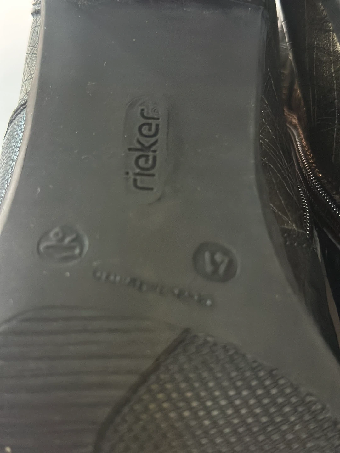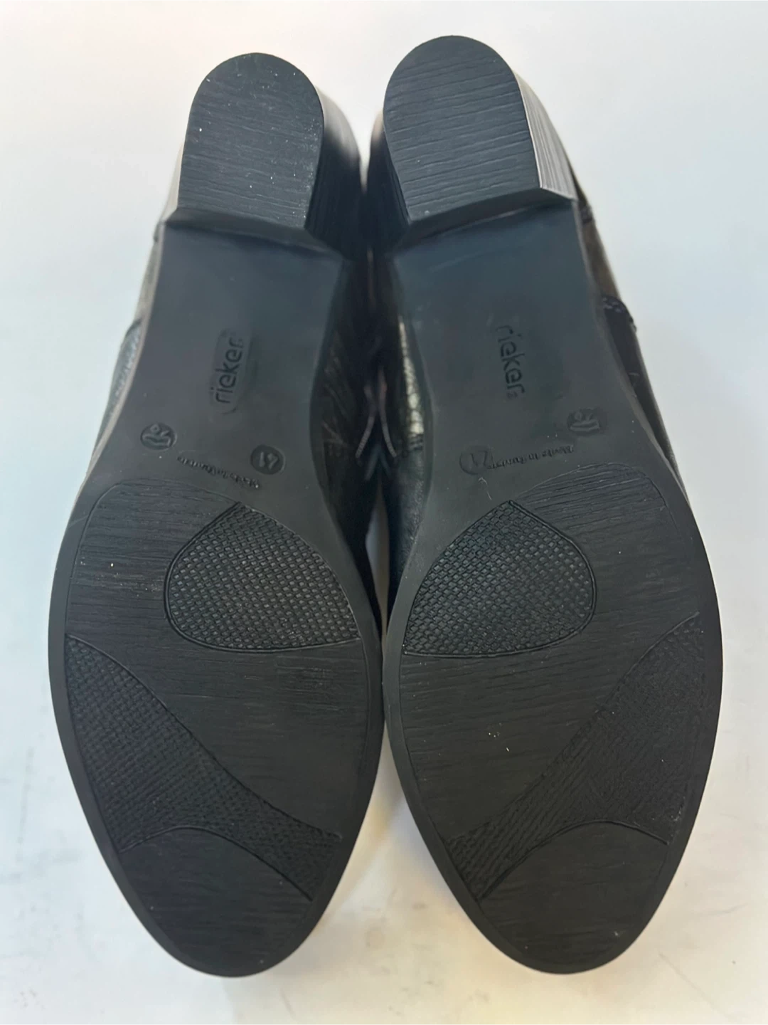 65Like New! In excellent pre-loved condition. RIEKER black leather heeled ankle boots. Size: EUR 41 / US 10 These boots feature a mix of textures and a comfortable heel height, perfect for adding a touch of style to any outfit. They have both laces and a zipper for easy wear. These shoes have been meticulously cleaned and sanitized. From a smoke free, pet free home. Pick up in Alta Vista.