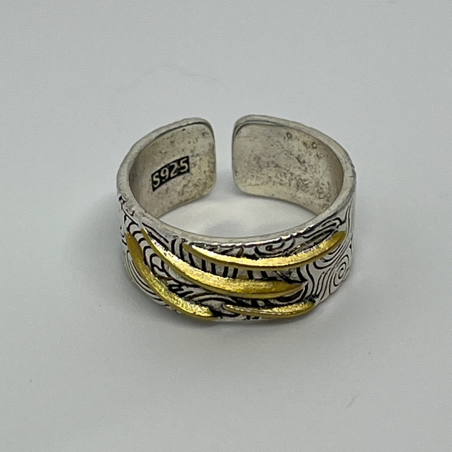 Selling a stylish silver ring featuring unique gold accents! The design includes intricate wave patterns. It's an adjustable ring, so it should fit most sizes comfortably. A great piece to add to your collection!