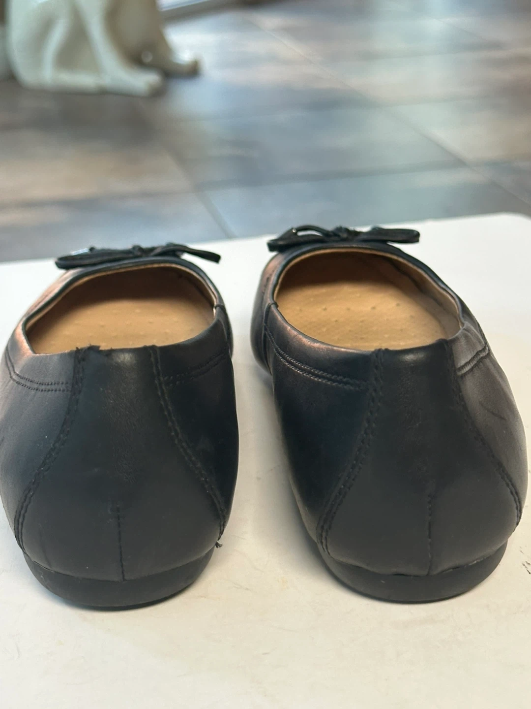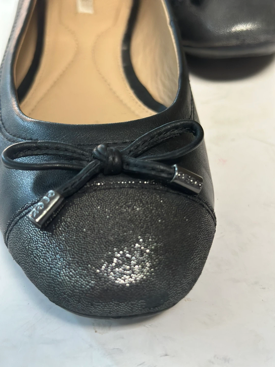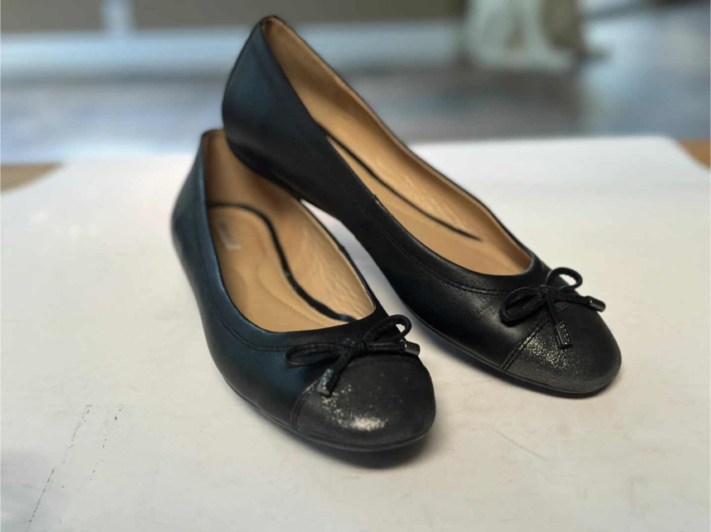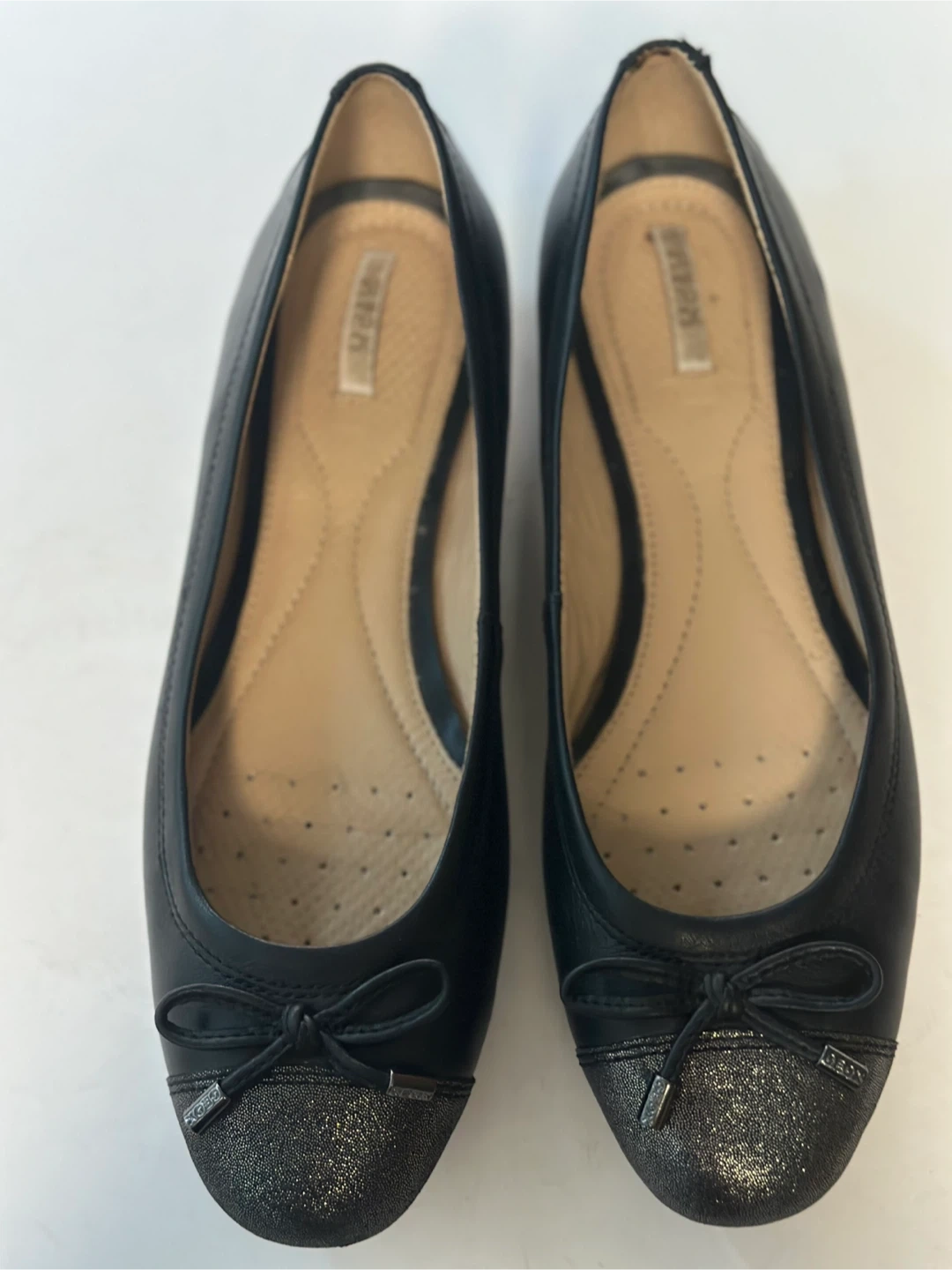 65In excellent preloved condition. GEOX ballet flats in black leather with sparkly toes and a comfort foot bed. Size: EUR 38 / US 7-7.5 These shoes have been meticulously cleaned and sanitized. From a smoke free, pet free home. Pick up in Alta Vista.