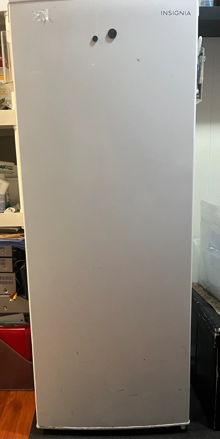 Selling an Insignia upright freezer in white! It's in good working condition and ready to keep your food frozen solid. Great for extra storage in the garage or basement