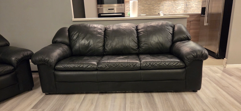 Selling a comfy black leather three-seater sofa. It's in good condition and ready for a new home! Perfect for a living room or family room, this couch offers plenty of space to relax and unwind after a long day. It's a stylish and practical addition to any home