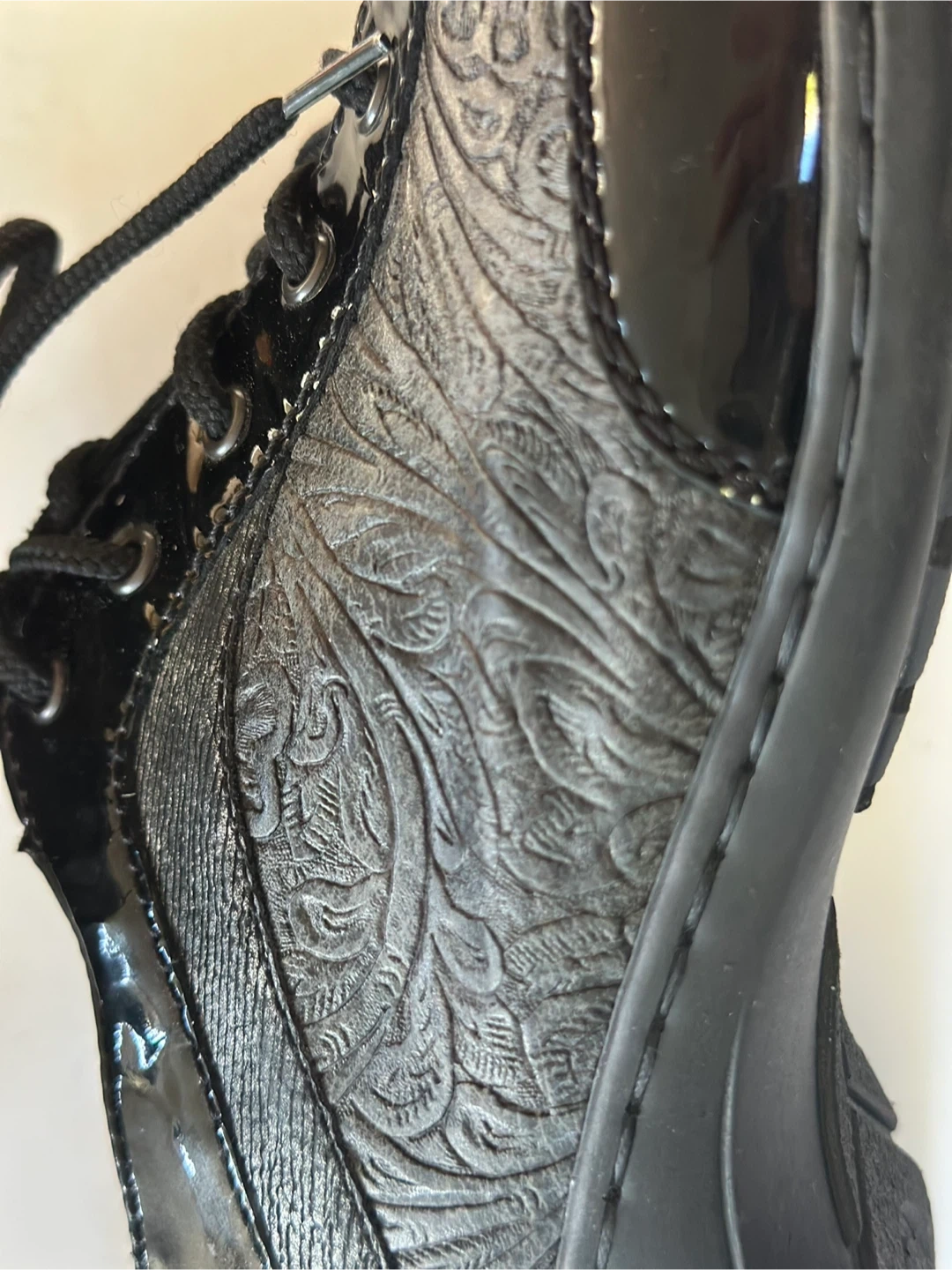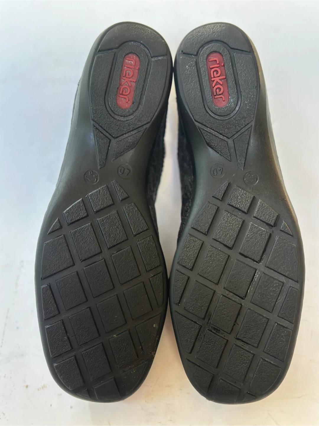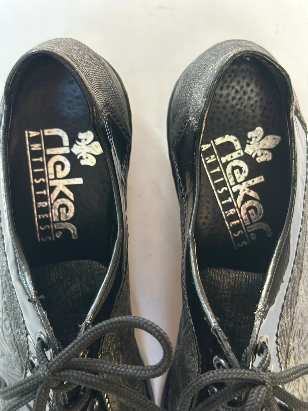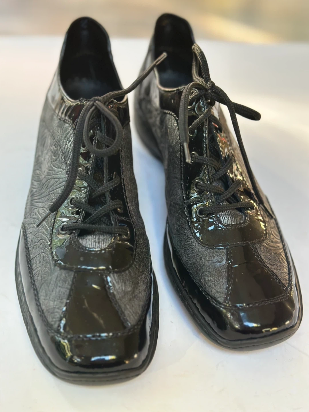 65Like NEW! Worn once ! RIEKER black leather dressy sneakers with patent accents. Size: EUR 40 / US 9- 9.5 These shoes have been meticulously cleaned and sanitized. From a smoke free, pet free home. Pick up in Alta Vista.