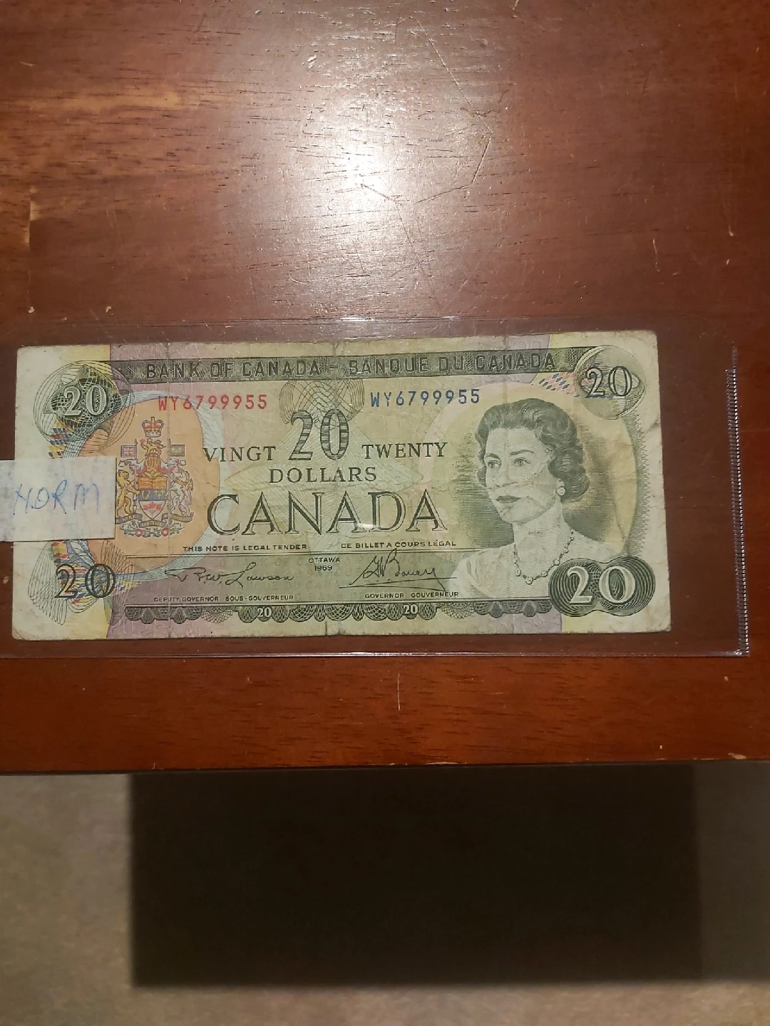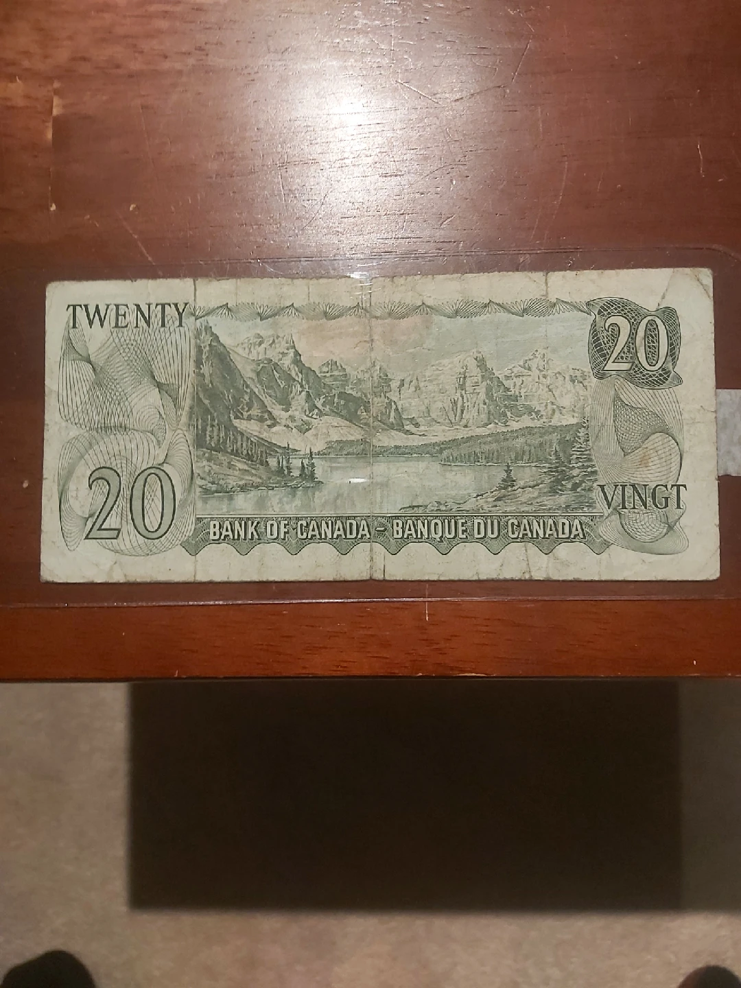 Selling a vintage Bank of Canada $20 bill. It features Queen Elizabeth II and a landscape scene on the reverse. A piece of Canadian history!
