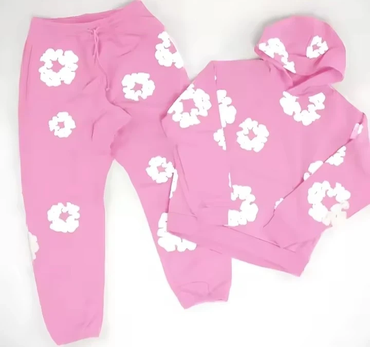 10denim tears cute pink hoodie and jogger set! The set features a matching hoodie and sweatpants, both adorned with a white floral pattern. It's perfect for lounging around the house or running errands in style. The material is soft and comfy, making it a great addition to your wardrobe!