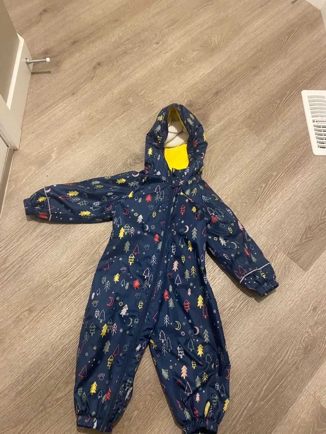 Cute snowsuit for your little one! It features a fun tree and moon pattern on a navy blue background, perfect for keeping them warm and dry during outdoor play. The hood is lined with a cozy yellow fabric.