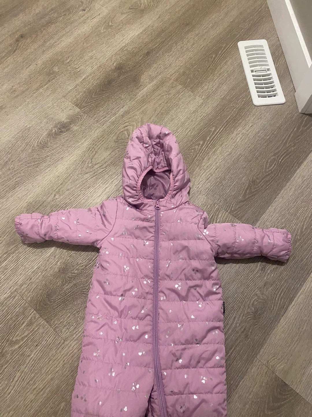 A cute purple padded snowsuit, perfect for keeping your little one warm and cozy during the winter months! It features a hood and a zipper closure for easy dressing.