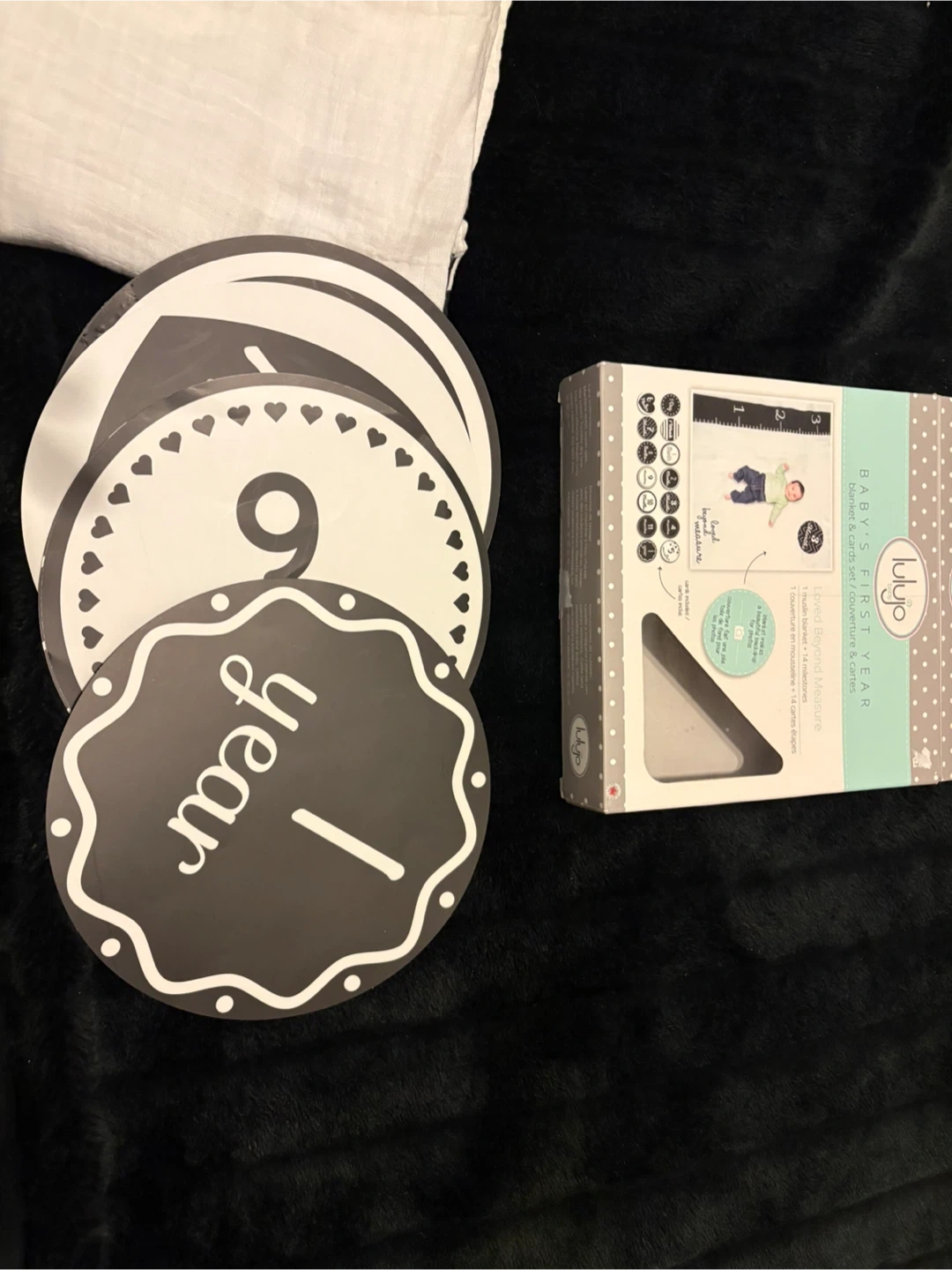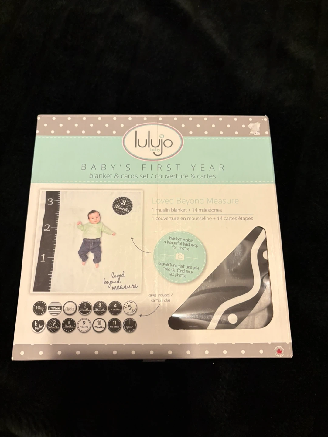 I'm selling a brand new lulujo Baby's First Year blanket and cards set! This set includes a muslin blanket and 14 milestones cards, perfect for capturing your little one's growth during their first year. The blanket is made of 100% cotton and measures 100cm x 100cm (40" x 40"). It can be used as a swaddle, stroller cover, baby blanket, and nursing cover. The box is included!