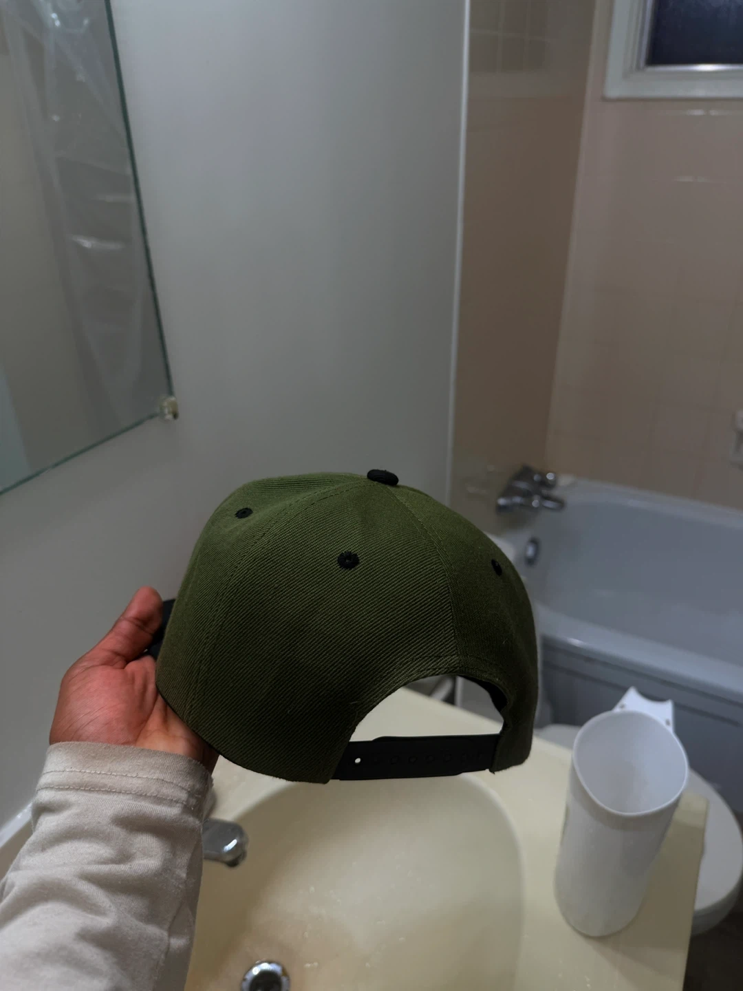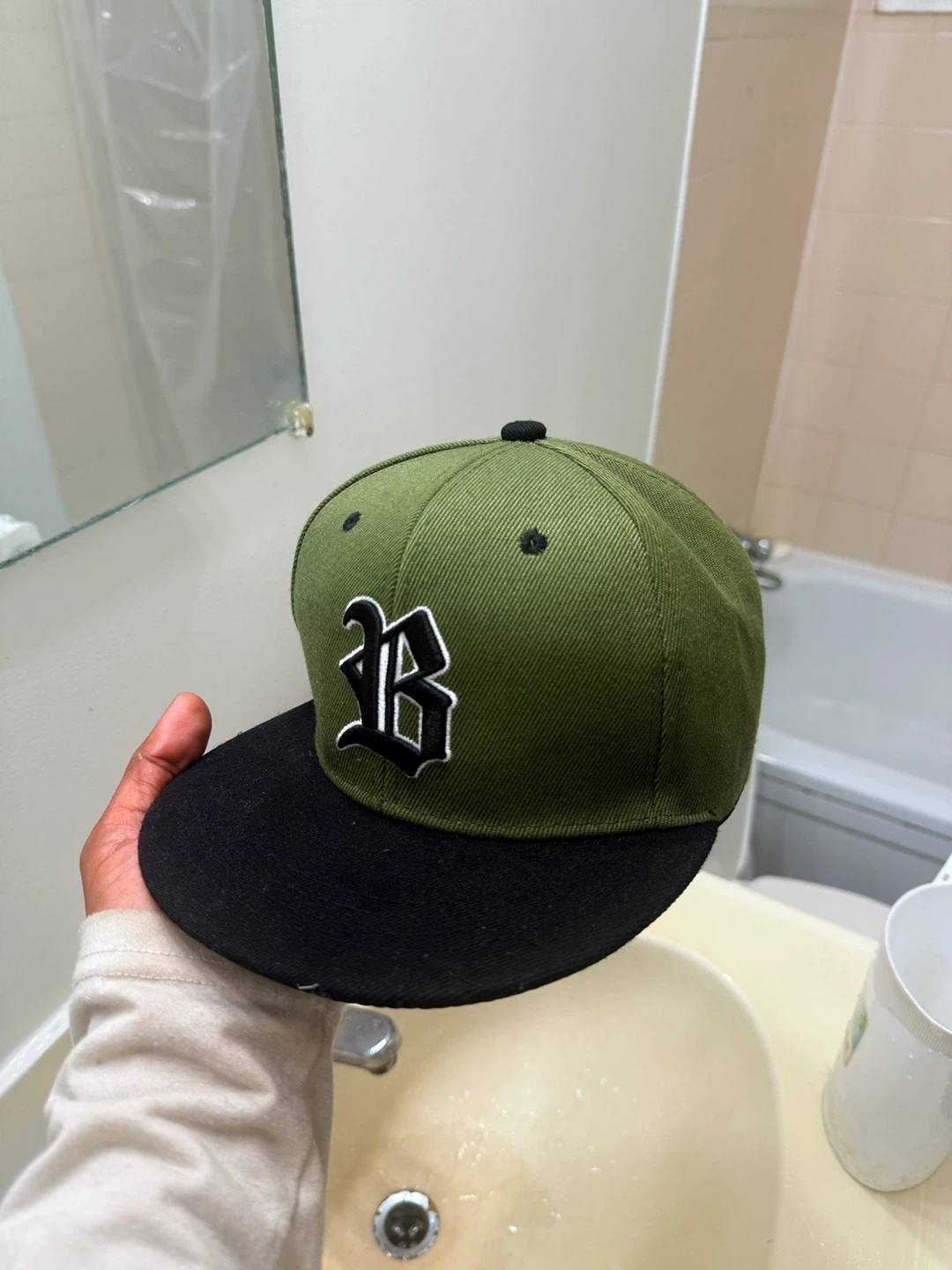 Selling a baseball cap in olive green with a black brim. It features a stylized 'B' logo on the front. Great for adding a pop of colour to your outfit!