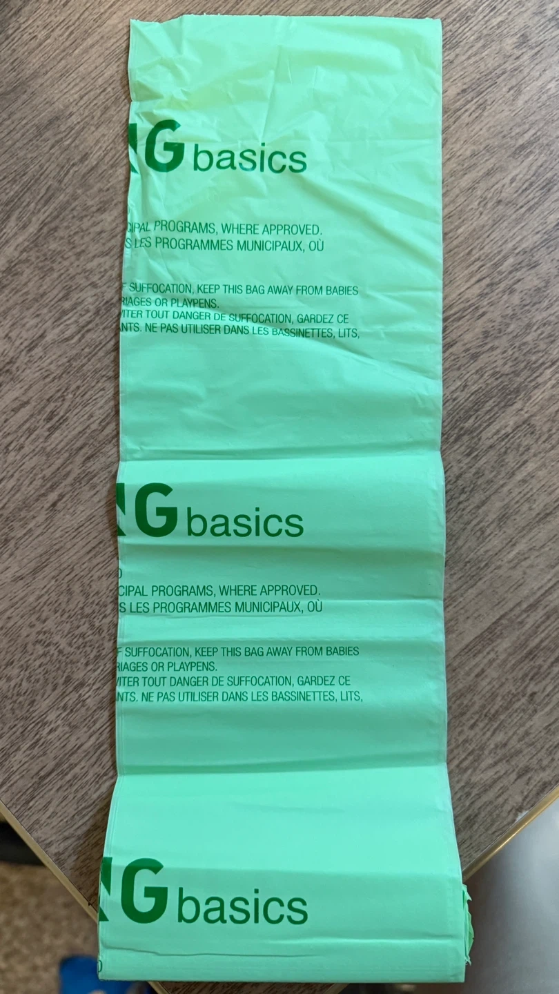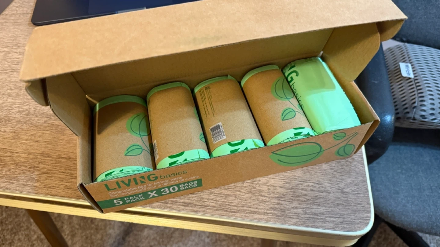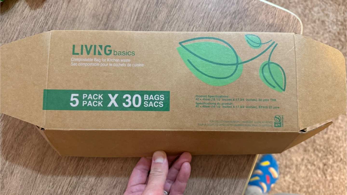 Selling a box of Living Basics compostable bags for kitchen waste! It includes 5 rolls, each with 30 bags. The bags are 42 x 46 cm (16 1/2 inches x 17 3/4 inches) and 22 μms thick. Perfect for keeping your kitchen tidy and eco-friendly!