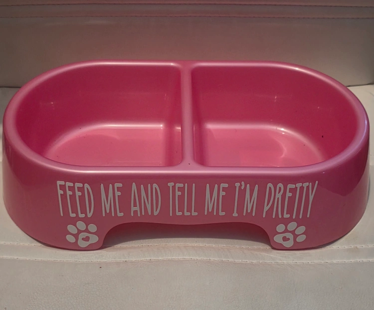 A cute pink pet food bowl. It's divided into two sections and has the words "Feed me and tell me I'm pretty" printed on the side with paw prints. Perfect for your furry friend!