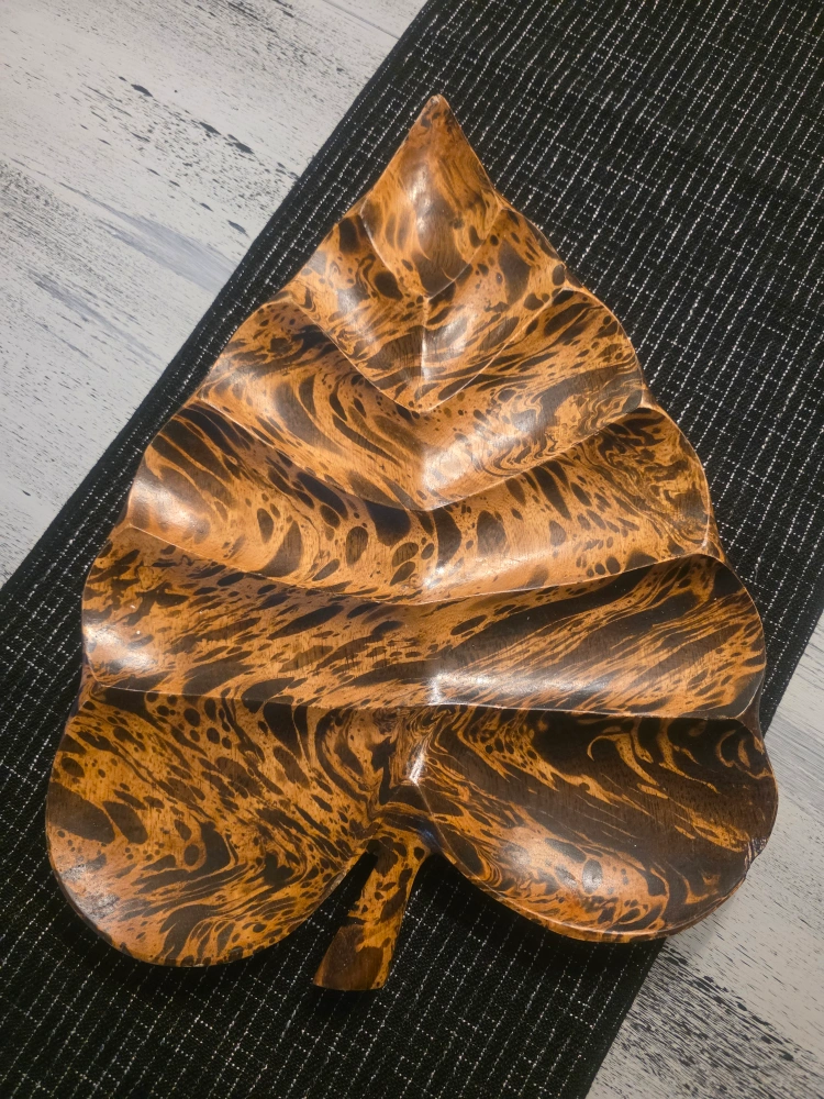 259A unique leaf-shaped wooden tray. It's got a lovely natural wood grain pattern in shades of brown. Perfect for adding a touch of nature to your home decor or serving up snacks in style. Pick up at Yonge and Steeles