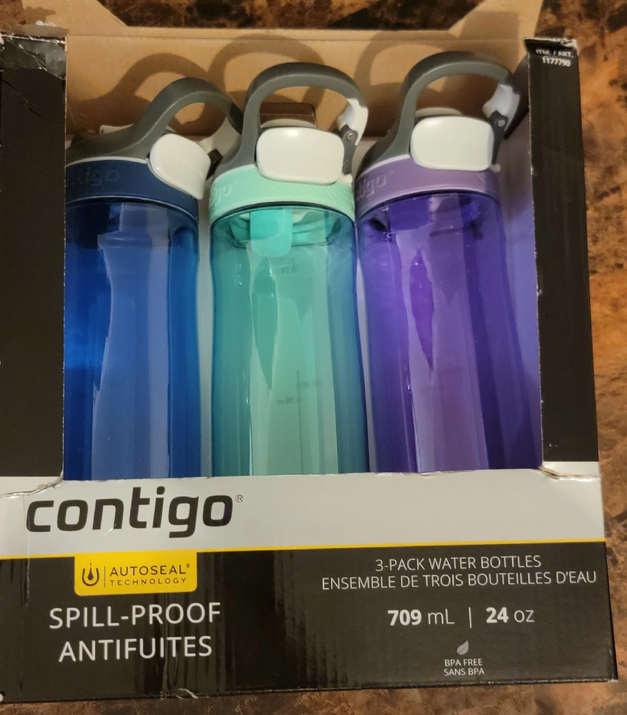 881Selling a brand new set of Contigo Autoseal water bottles! This is a 3-pack, each bottle holding 24 oz (709 mL). They're spill-proof and BPA-free, perfect for staying hydrated on the go. The box is included!