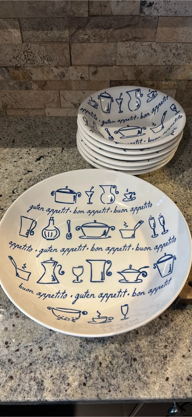 82Gorgeous white & blue vintage set Made in Italy 1 big serving bowl 5 pasta bowls Great condition dishwasher and microwaveh safe Pick up Winston Churchill and Thomas Street no holds without deposit please thanks