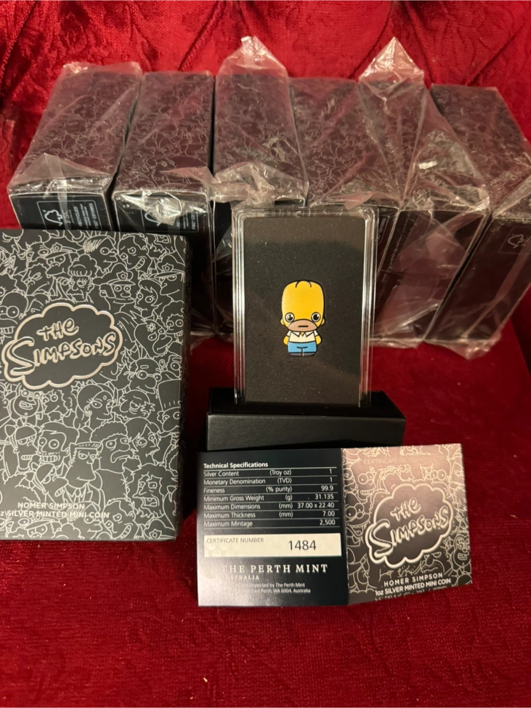 1000+Selling a The Simpsons Homer Silver Mini Coin. Technical Specifications: - Silver Content: 1 (Troy oz) - Monetary Denomination: 1 (TVD) - Fineness: 99.9 (% purity) - Minimum Gross Weight: 31.135 (g) - Maximum Dimensions: 37.00 x 22.40 (mm) - Maximum Thickness: 7.00 (mm) - Maximum Mintage: 2,500