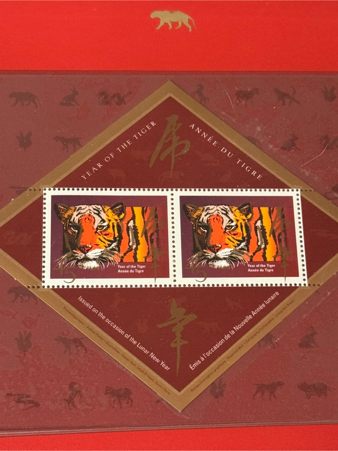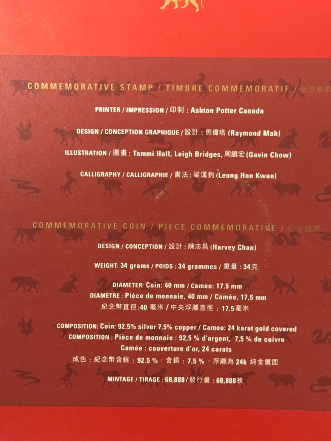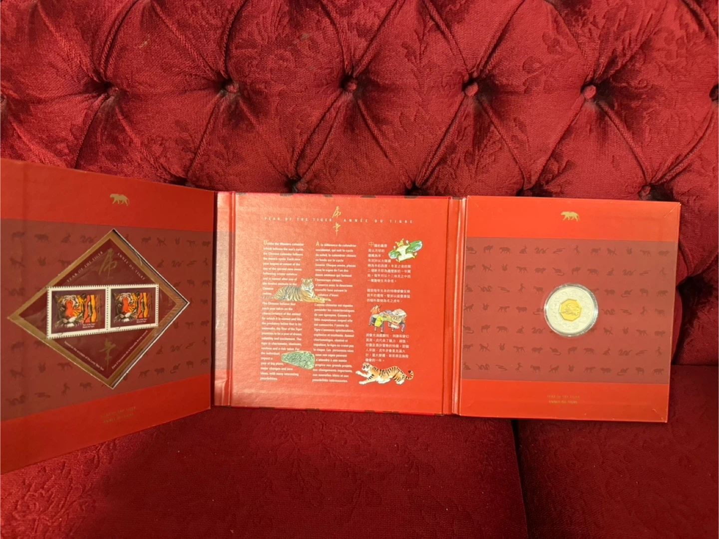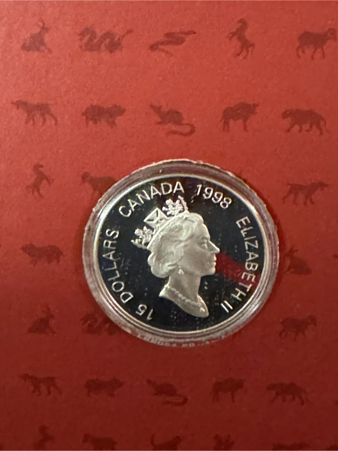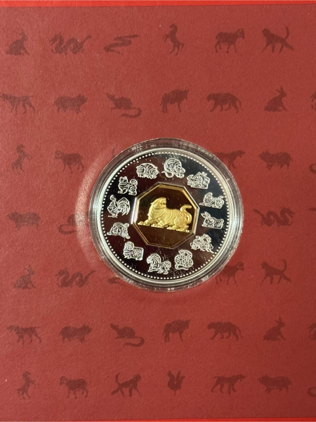 1000+Selling a 1998 Canadian $15 commemorative coin celebrating the Year of the Tiger. The coin is 92.5% silver and 7.5% copper, with a 24-karat gold covered cameo. It weighs 34 grams and has a diameter of 40 mm. The cameo diameter is 17.5 mm. It comes with the commemorative stamp and original packaging.