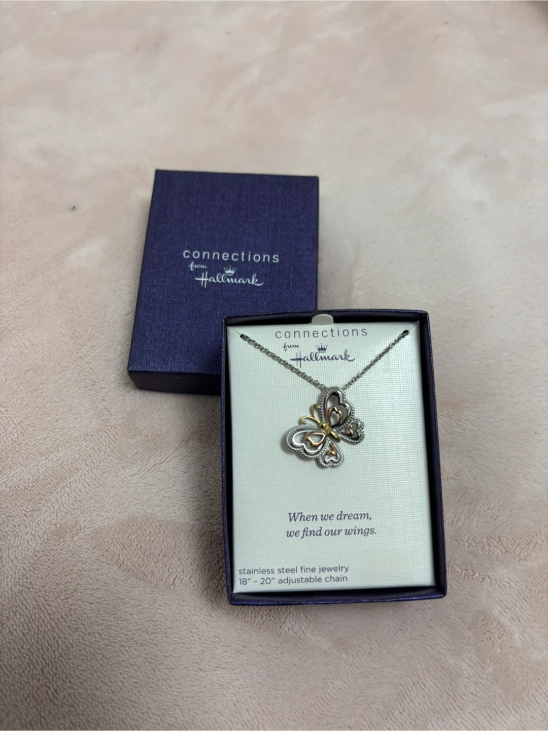 Selling a beautiful Hallmark Connections butterfly necklace! This necklace is brand new and comes in its original box. The chain is stainless steel and adjustable from 18" to 20". It's a lovely piece of fine jewelry!