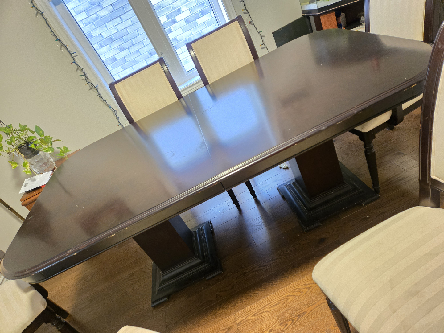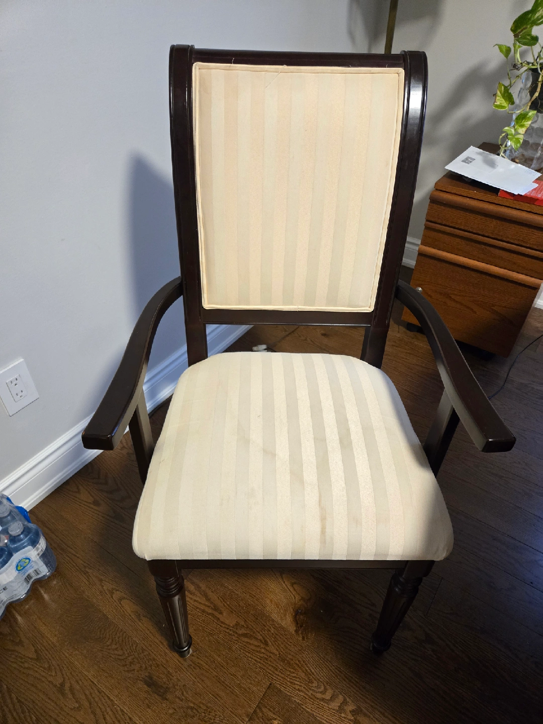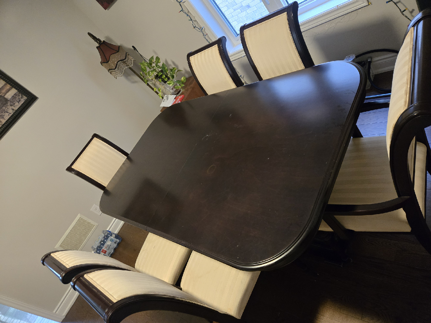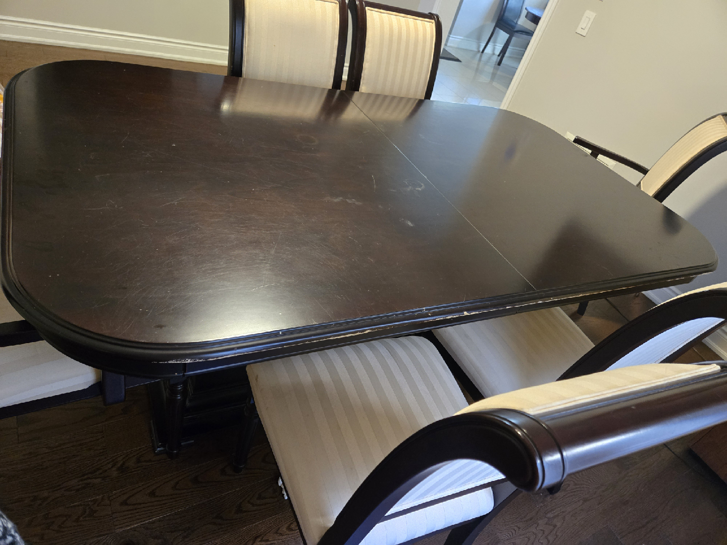 Selling a stunning, high quailty dining table with six chairs. The set features a dark wood finish with cream-colored striped fabric on the chairs. There are some signs of use, as shown in the pictures, but overall it's a sturdy and functional set for your dining room!