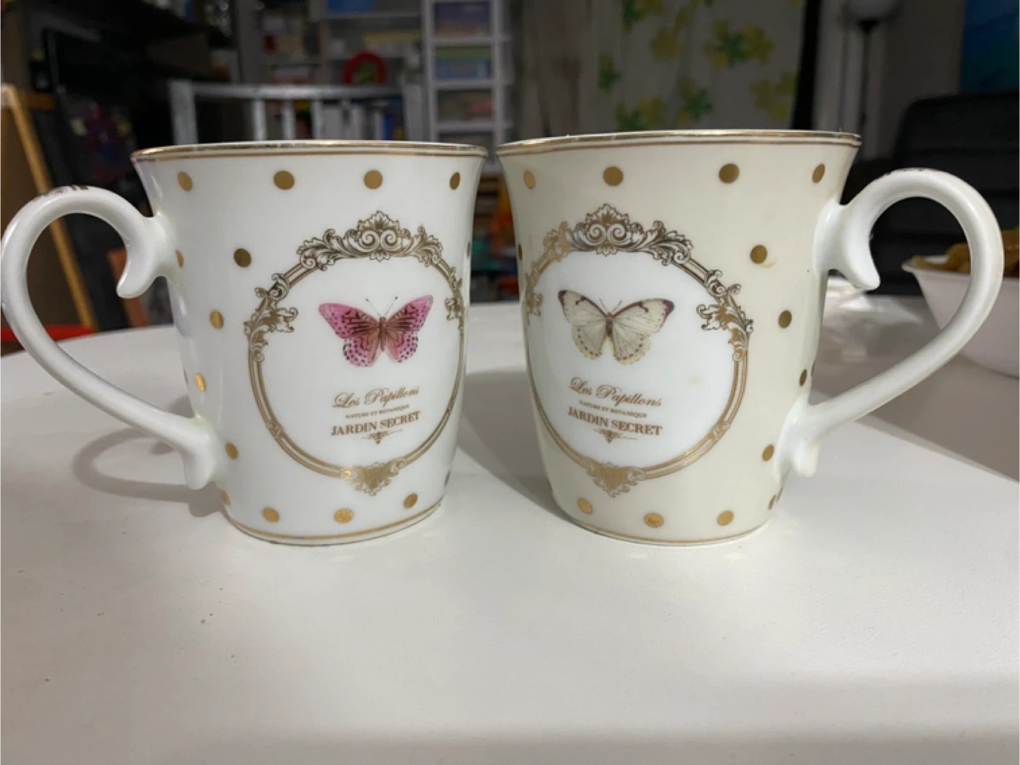 85Selling a set of two lovely mugs from Elegance Dora Papis! They're from the Jardin Secret collection and feature a beautiful butterfly design with gold accents and polka dots. These mugs are not microwave or dishwasher safe, so please handle with care