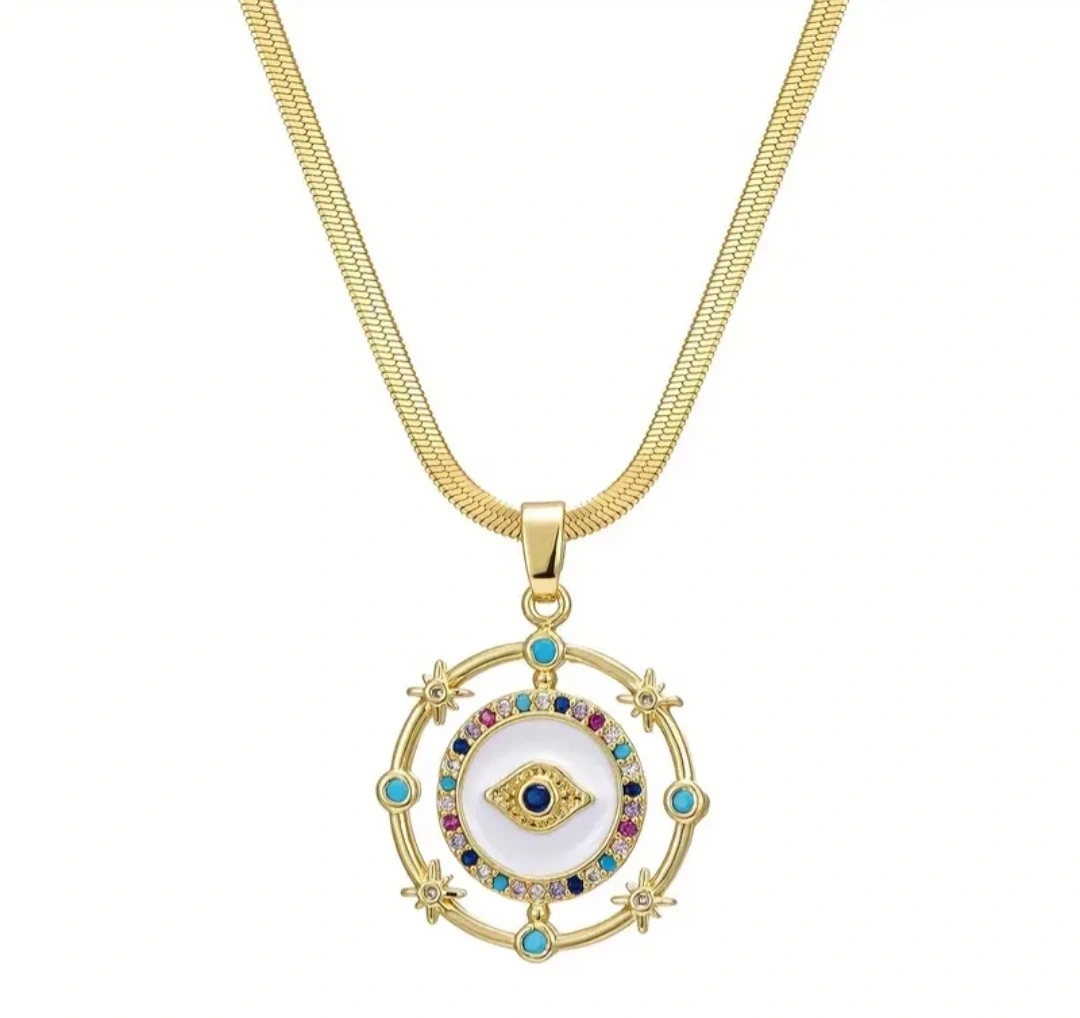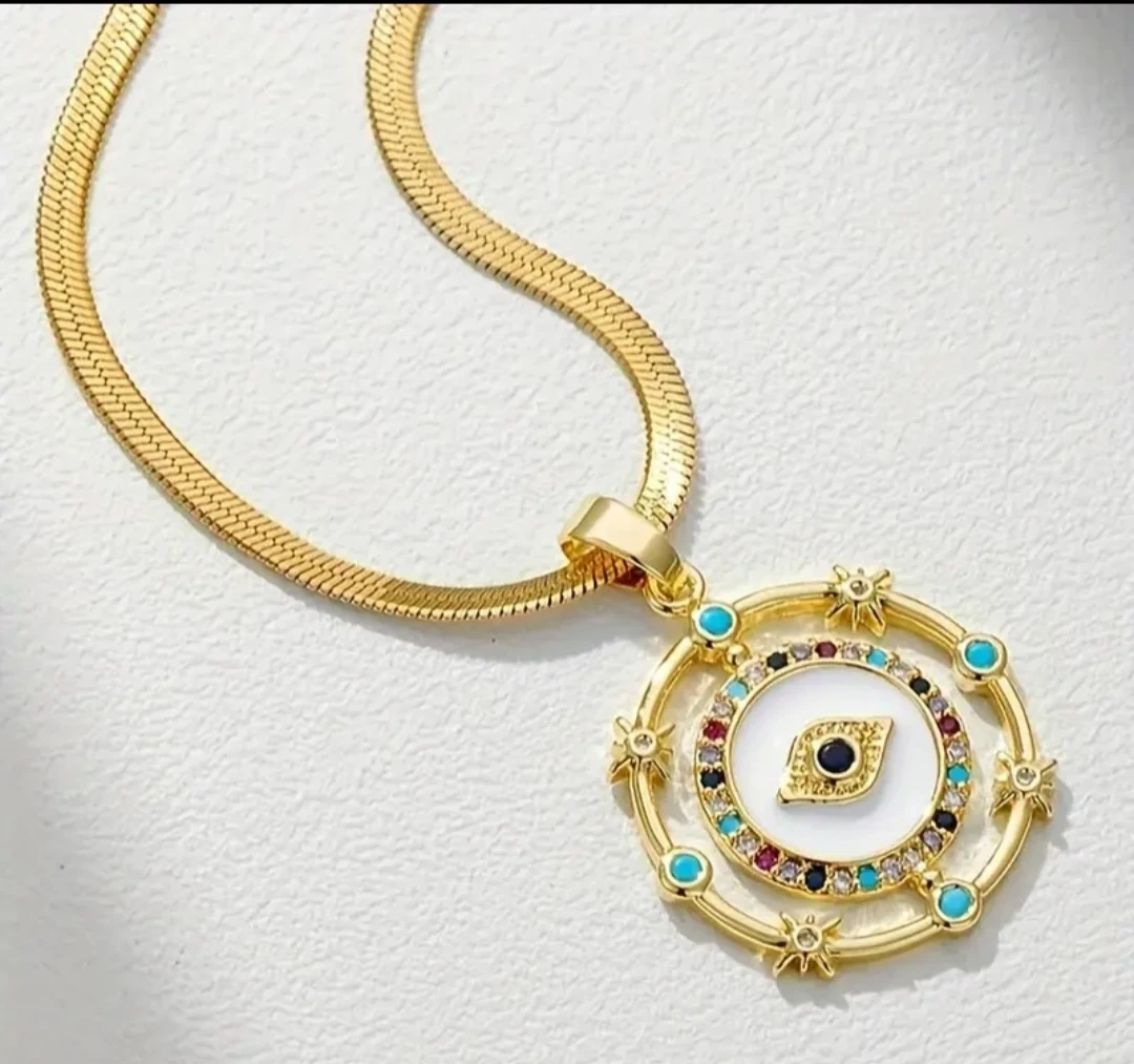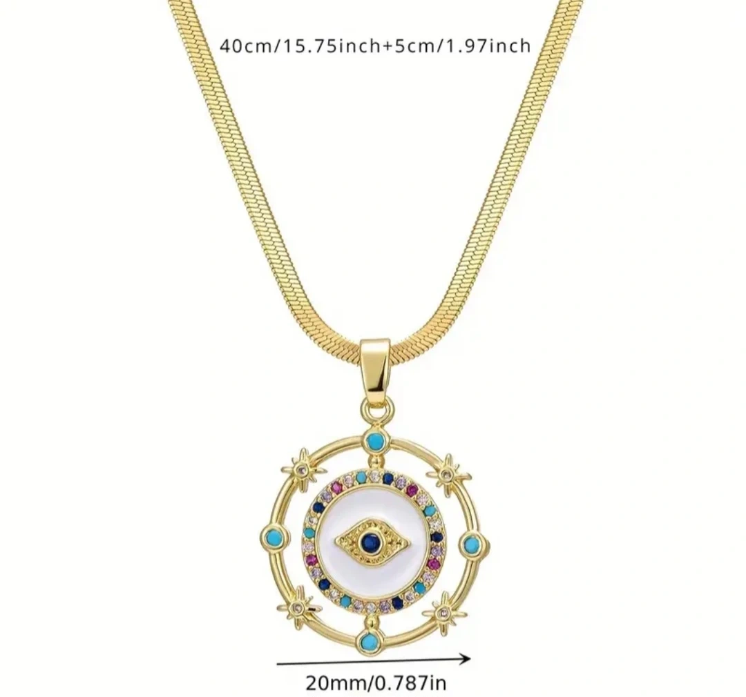 Check out this lovely gold-tone necklace! The pendant features an evil eye design surrounded by colourful accents. The chain length is approximately 15.75 inches (40cm) with an additional 1.97 inches (5cm) extension. The pendant diameter is about 0.787 inches (20mm). Brand new and ready to add a touch of sparkle to your outfit