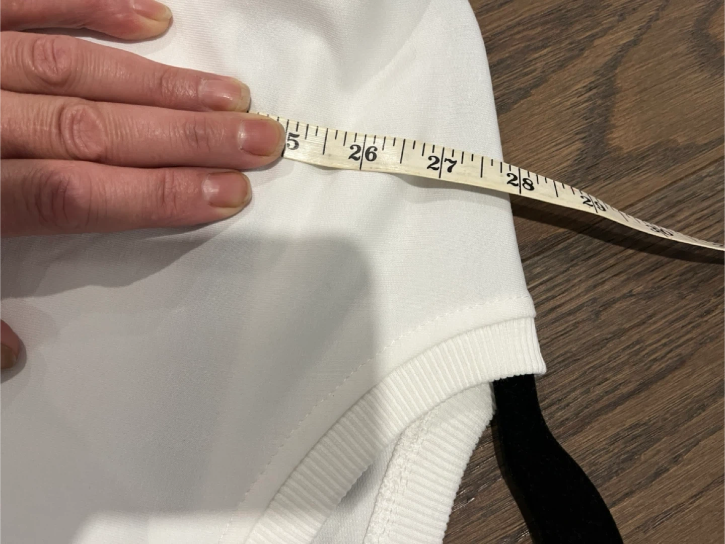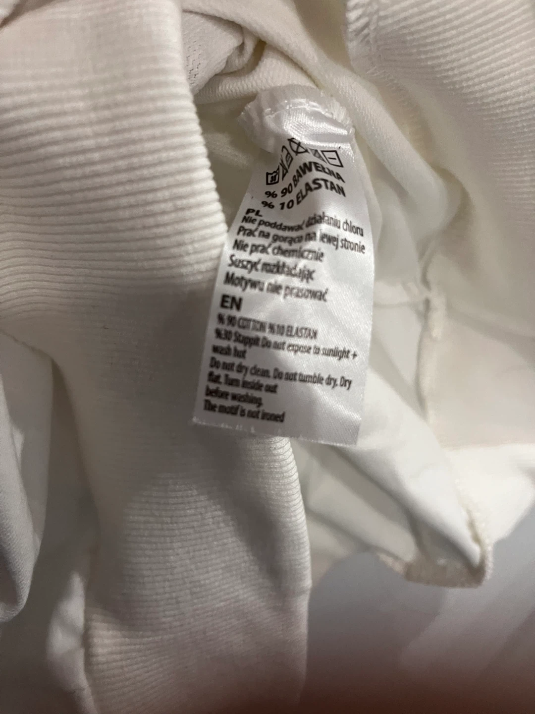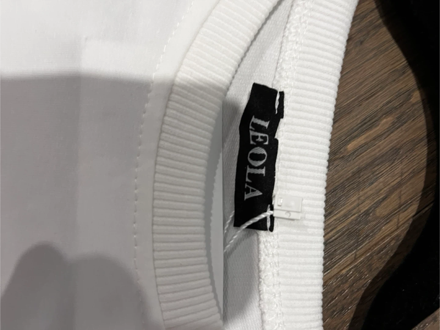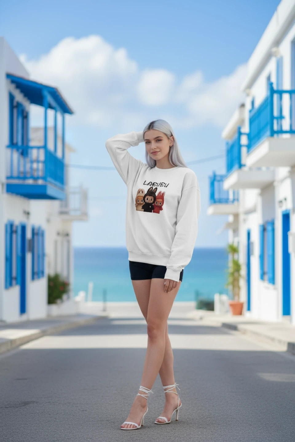 Selling a LEOLA white sweatshirt with a Labubu design. It's in great condition. The size is medium. The length is approximately 23 inches, and the width is approximately 27 inches