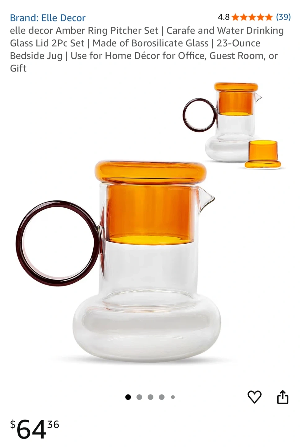 26Selling an Elle Decor Amber Ring Pitcher Set! It includes a carafe and water drinking glass lid. This 2-piece set is made of borosilicate glass and holds 23 ounces. It's perfect as a bedside jug or for home decor in an office, guest room, or as a gift! Opened box, bought for $72 including tax