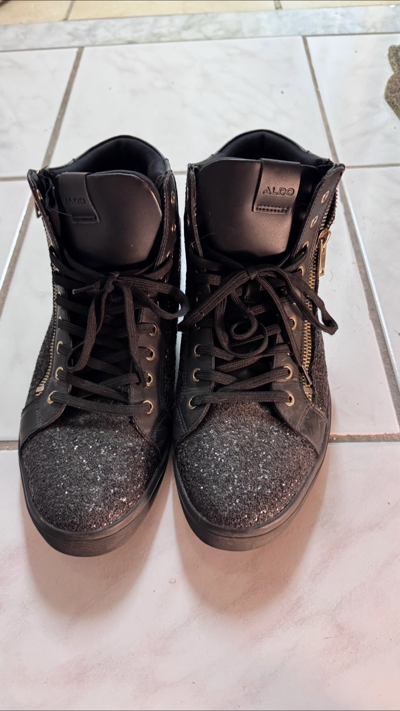 These Aldo high-top sneakers are a stylish addition to any wardrobe! They feature a unique black glitter design, adding a touch of sparkle to your look. The size is US 8.5. Perfect for adding some flair to your everyday outfits!