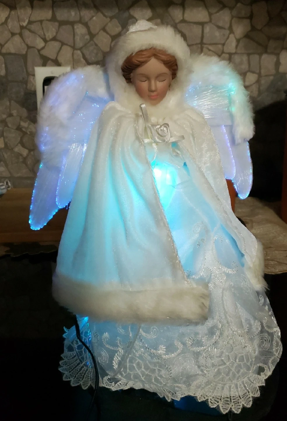 Add a touch of magic to your Christmas tree with this beautiful angel tree topper! It features fibre optic wings that light up with a soft, ethereal glow. Perfect for creating a festive and enchanting holiday atmosphere. Aporix 12 in high.