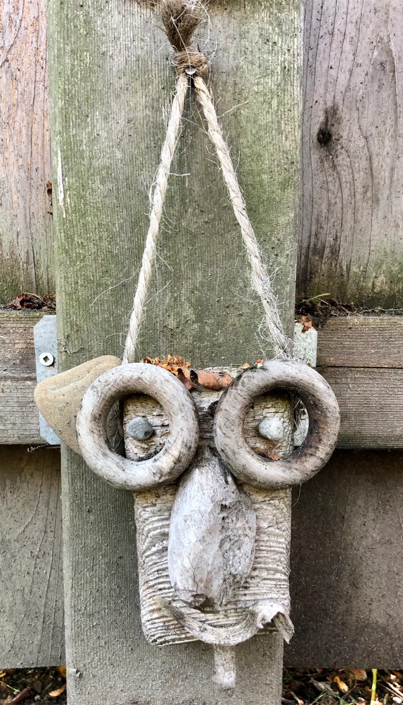 Here's a unique piece of wall art! It's made from wood, rope, and stones, giving it a rustic, natural look. Perfect for adding a touch of whimsy to your garden or home decor