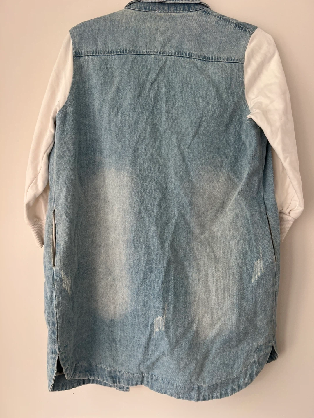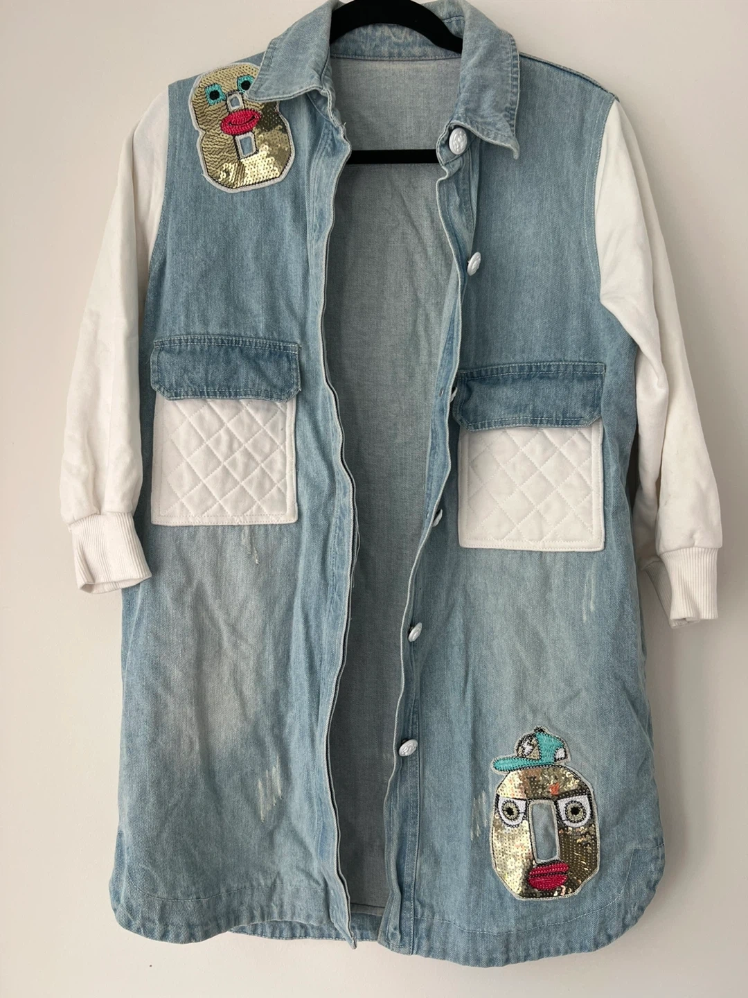 83Here's a unique denim jacket with some fun sequin appliqués! It's a light wash denim with white quilted pockets and sleeves. It's in great condition and ready for a new home!