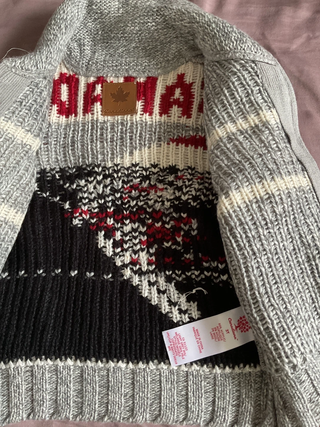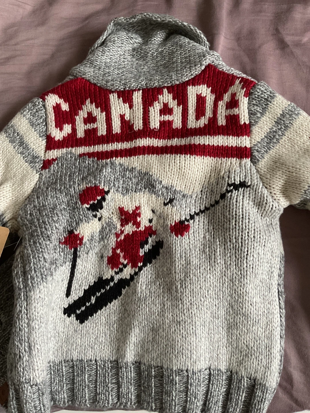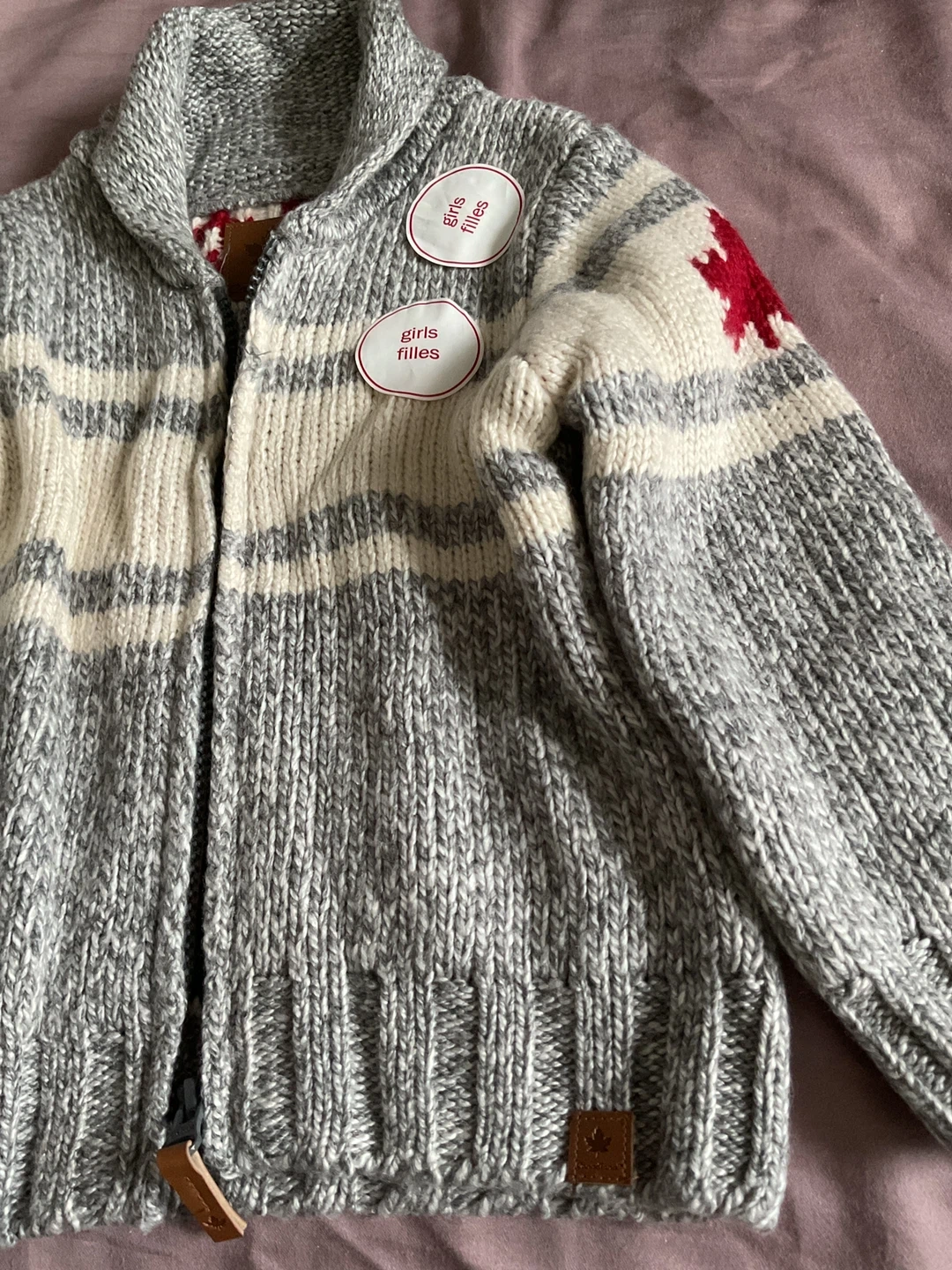 1000+Super cute Canadiana knit cardigan for girls, size 1T! It features a lovely grey and white striped pattern with red maple leaf accents on the sleeves. The back has a fun design with the word 'CANADA' and a skier. The tag shows it was originally $34.99
