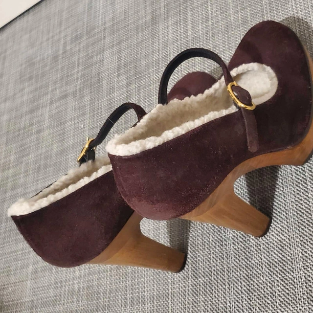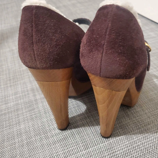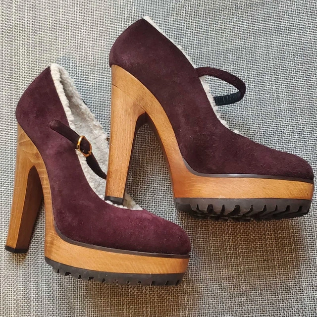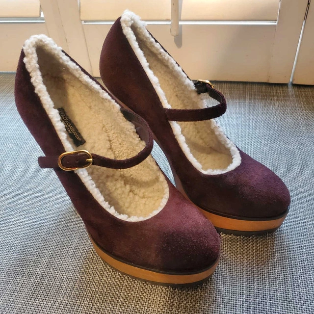 91Elevate your style with these Dolce Gabbana platform heel shoes featuring a luxurious dark burgundy/ purple suede exterior and cozy shearling lining, perfect for adding a touch of opulence to any outfit. Made in Italy. Like new condition Key features include: - Brand: Dolce & Gabbana - Style: Platform heels - Size EU 38 - Material: Suede exterior, shearling lining on a wood platform with rubber soles - Made in Italy