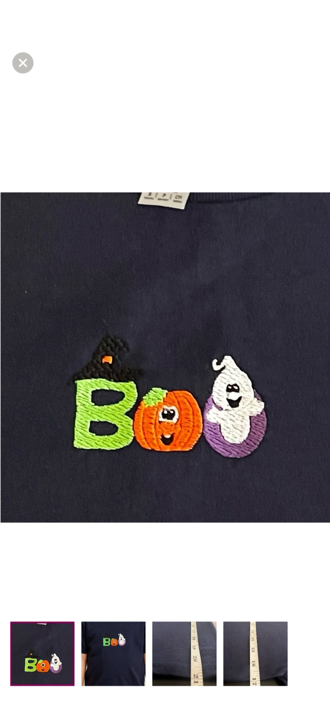 Here's a custom navy blue Gildan t-shirt with a cute Halloween theme! It features the word "Boo" with fun, embroidered designs. The "B" is green with a witch hat, the "O" is an orange pumpkin, and the other "O" is a ghost. It's perfect for the spooky season